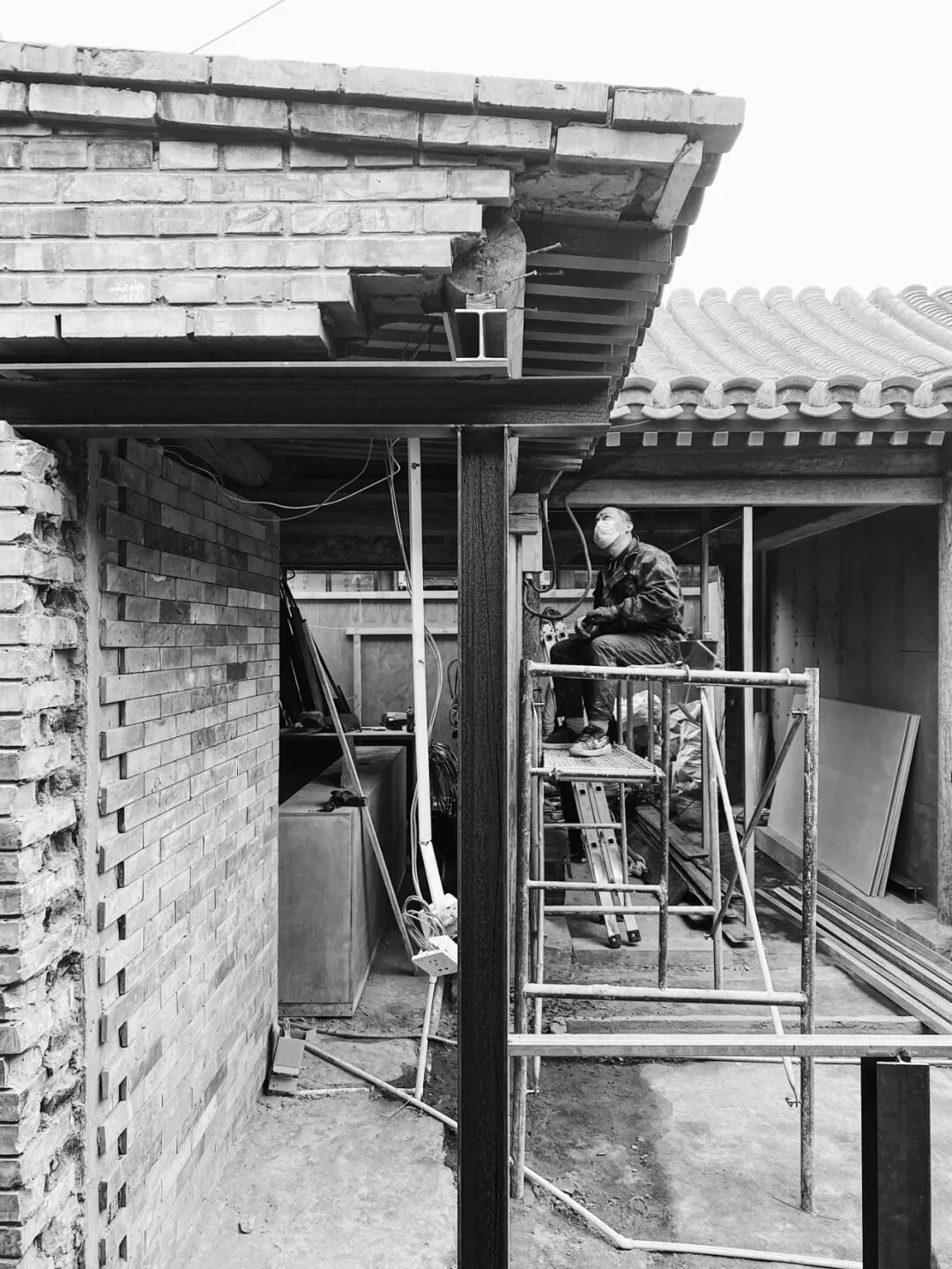 项目所在的小院隔壁和对面都是原住民,占地面积 88 平方米,坐南朝北,由三个独立的单体组成。前屋的主体木结构为两开间五架梁的古建原构,后屋和旁屋均为后期新建的单坡平房,三屋围合着一块 24 平米的室外空间。