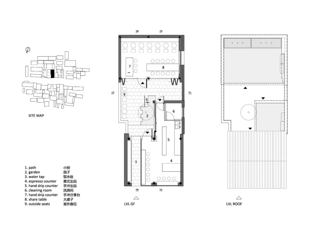 因为尺度的关系,原本的院子实际体感更像是宽一点的室外走道。设计通过一条回路连接室内外,现在院子是整个空间序列的重要一环,而面向内院的界面皆可任意打开。客人可在房檐下坐,在矮墙下坐,也可在走廊边席地而坐。视线可聚集在园子中心,也可越过屋脊飘向远处的古建。园中植物旁设有取水处,用于日常的浇灌,同时也方便客人在品尝咖啡前洗净双手。