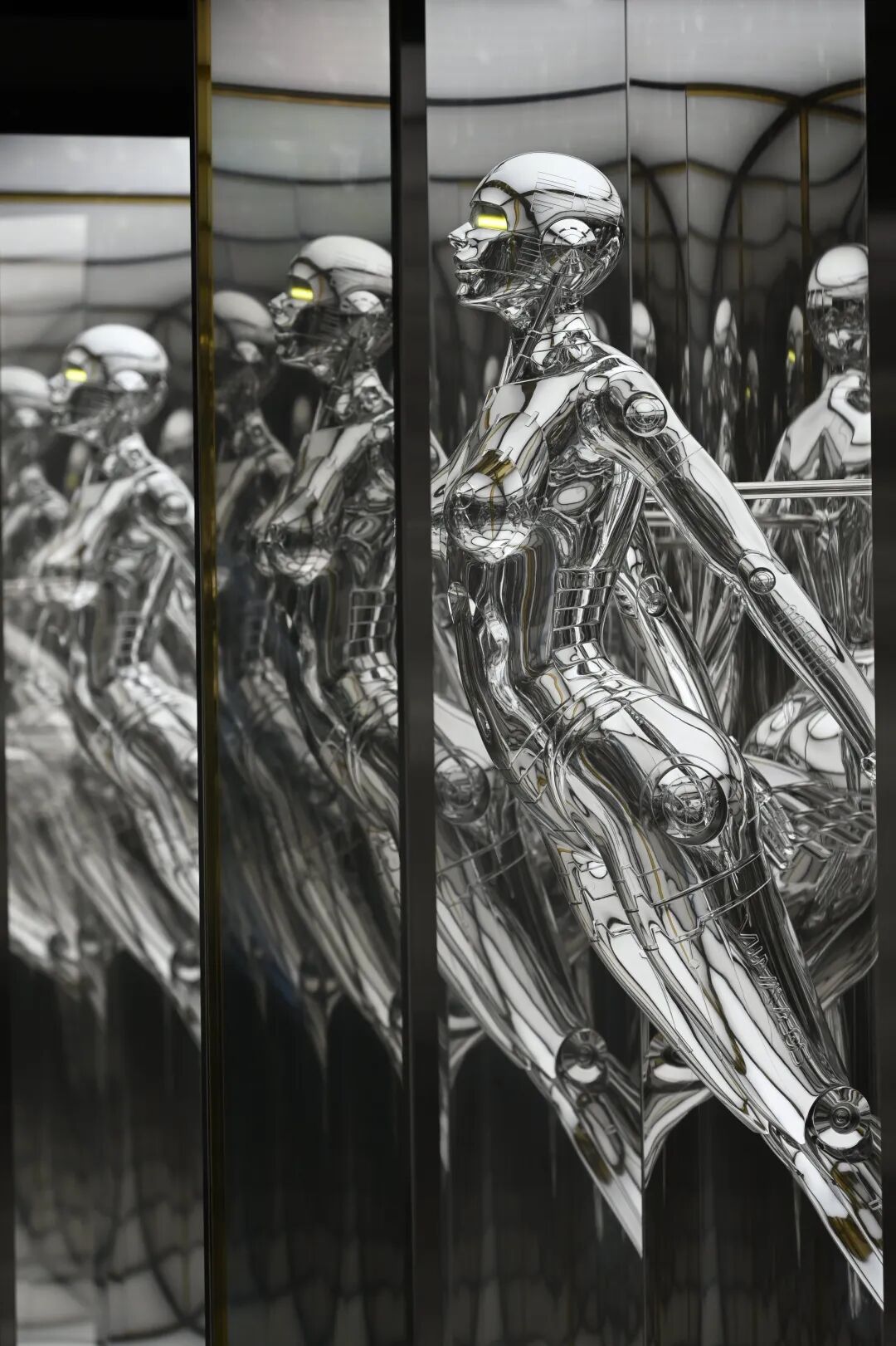 空山基,《悬浮机械姬版本2》,2022,ABS树脂、纤维玻璃、不锈钢、电镀银喷漆、LED灯,共6件,每件:270 × 103 × 108 cm。©空山基。图片由UCCA Lab提供