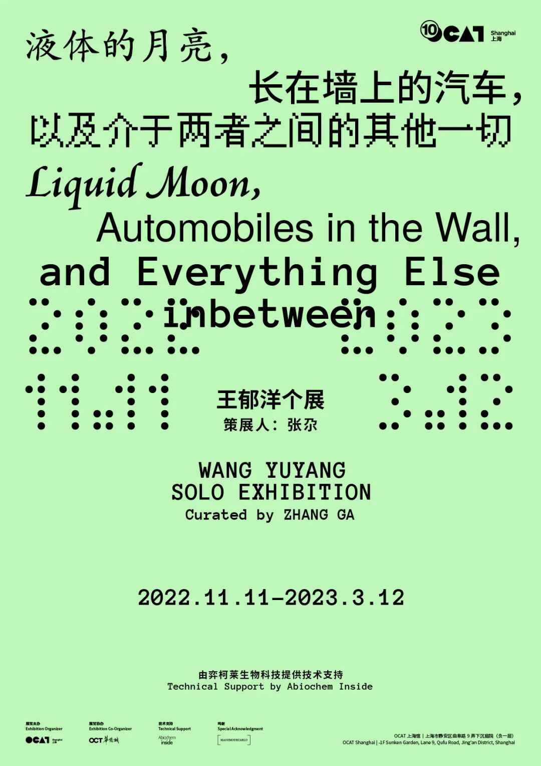 OCAT于是成为一种“情境”(situation),可以说是机器中发生的情境,因为它是机器筹划的场景。不过,它不似让·丁格利(Jean Tinguely)所营造的那种由吱嘎作响和冒烟的装置构成的场景,他最著名的作品之一就是在大概 60 年前的纽约现代艺术博物馆的雕塑花园中发生过的壮观的爆炸。OCAT的场景是由机器构思出来的。因此,它并不遵循情节线索展开,而是如粉笔和奶酪一样格格不入,融合、纠缠、泄漏、聚合、空白,展现出某种挑衅的特点:液体的月亮、卡在墙上的汽车、真菌和蔓延的藻类。它使得观者在身体和情绪上都不知所措。在丁格利的情境中,机器执行了人类的梦想;而在王郁洋的情境中,机器则规定了人类的场景。