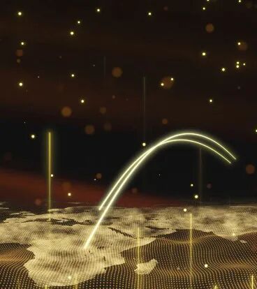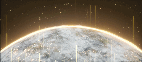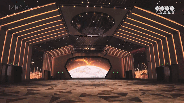 场景从宏大的全球化视野演绎在地球之外的视点观看太阳于地球边际线升起的大气科幻性景观。侧屏则为科技感的数据海洋,以虚拟粒子表现出当时代万物互联的弧形线条跃于海面,各相连结,竖状的粒子数据串向上蒸腾、生发形成强烈光束向太阳中心迸进、汇聚。主题场景展现出时代发展所激发向上的活力与广阔的视野,对于企业年会活动等场景渲染与氛围烘托具有极高的适配性。