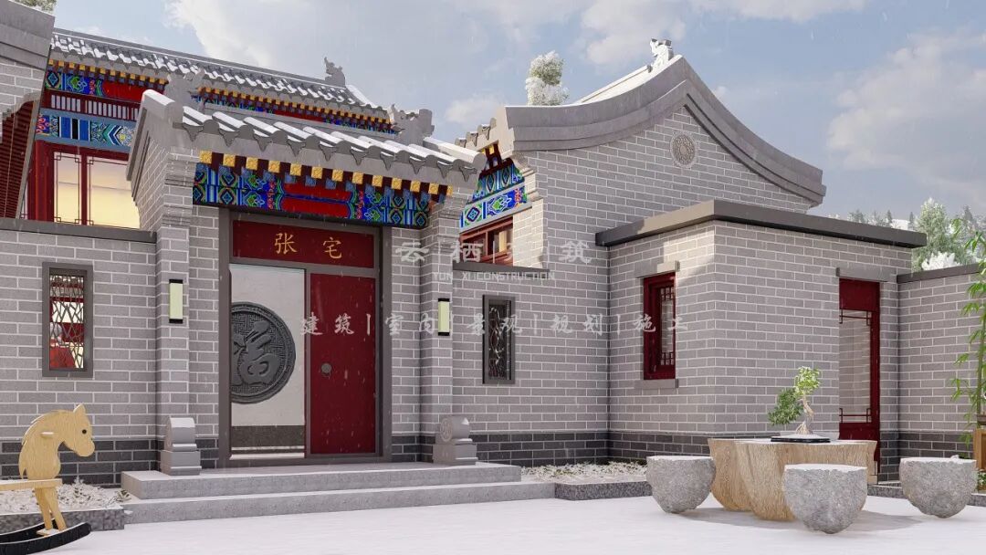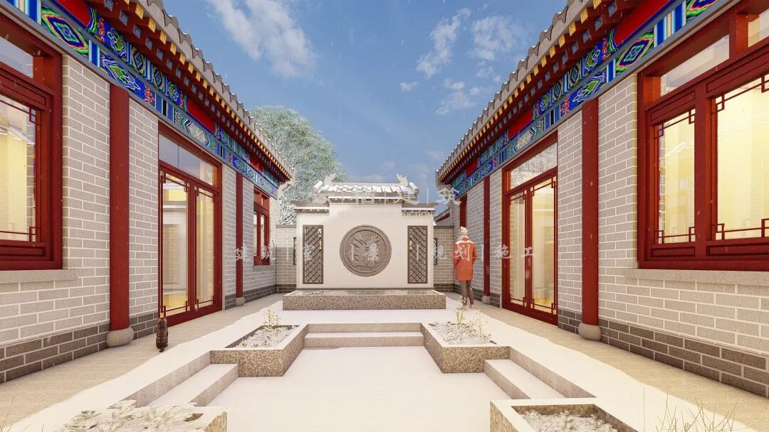 建筑采用传统中式合院配色,整体以小青砖为主,门窗、装饰线条、门头、柱子等均为中式朱砂红,采用朱红色,打造中式古典合院意境。