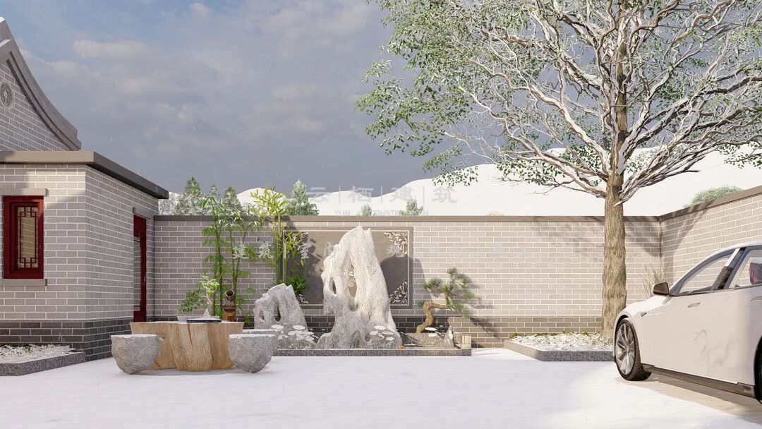 一进门的庭院摆放户外石质座椅,可用于品茶或下棋,南侧设了停车位,可以直接把车开入庭院,生活品质十分的高,同时温度满满。
