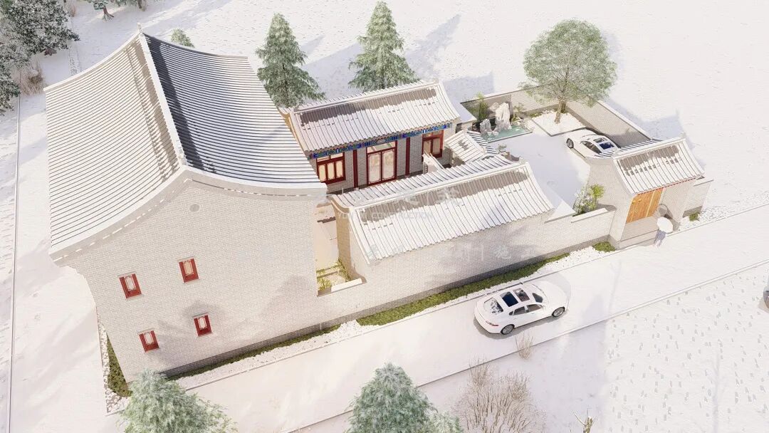 整个建筑形体严格按照中轴线对称式设计和布局,院门居中,满足传统三合院的形制要求。院门正对影壁,增加对景设计,同时避免庭院空间一览无余。