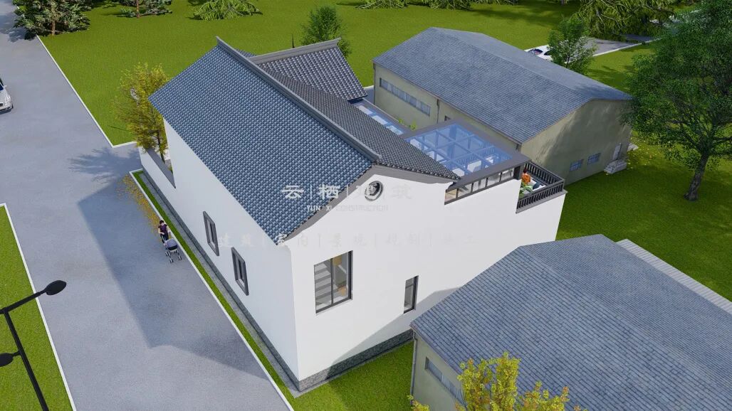 建筑整体为U字形,结合建筑形体屋顶采用人字坡组合的方式,露台部分以阳光房为主,增加实用性。