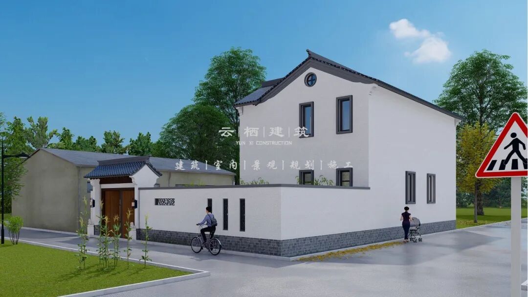建筑放置在了场地的西北则,将东侧庭院退让出来方便后期停车使用。因考虑院内停车,所以院门设计的比较宽,双开木门,结合主房渲染新中式氛围,奠定整个建筑基调。
