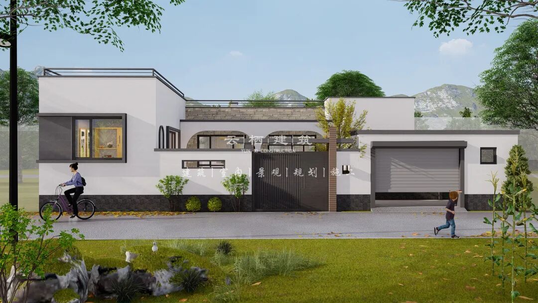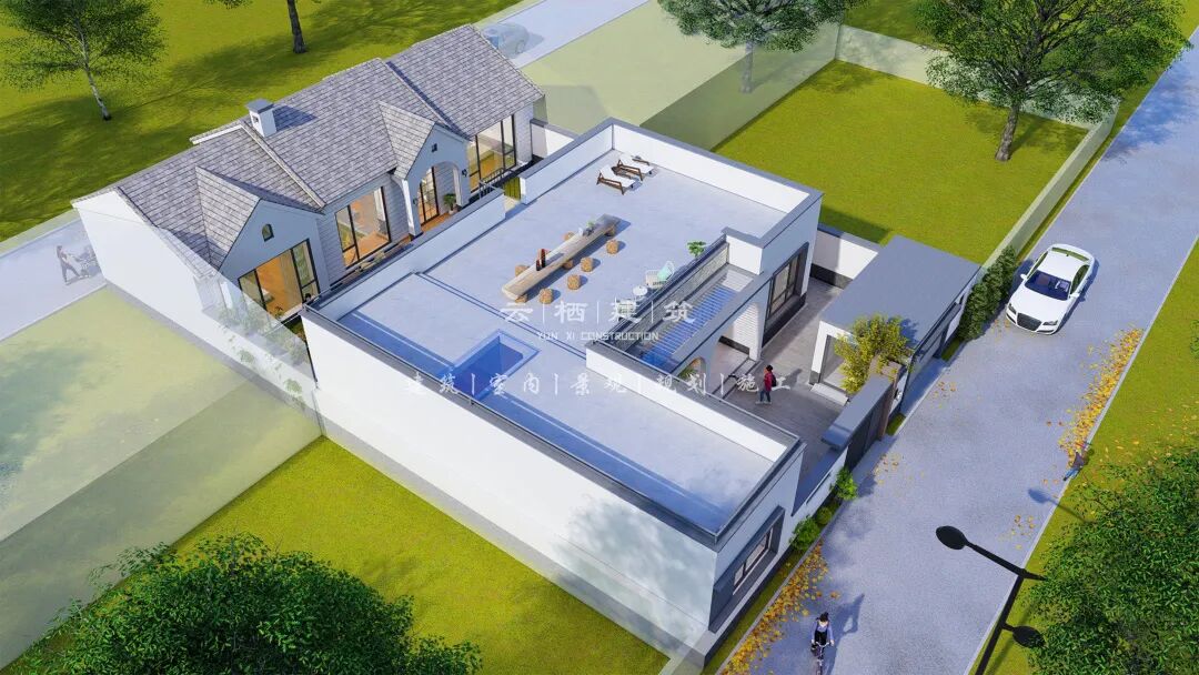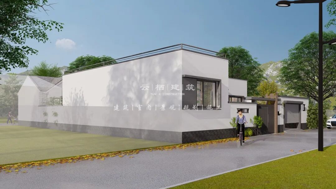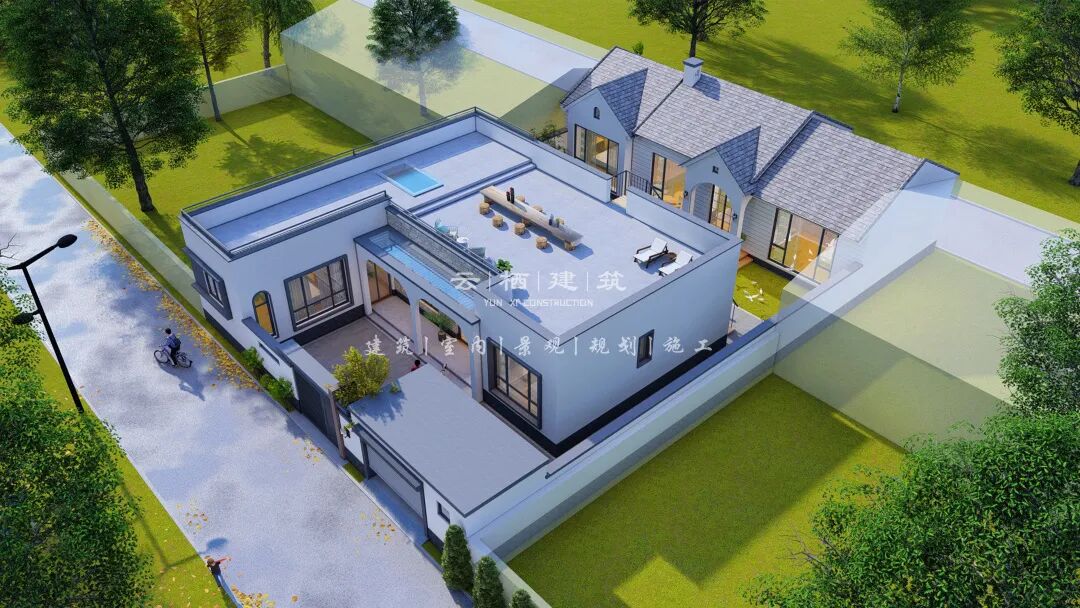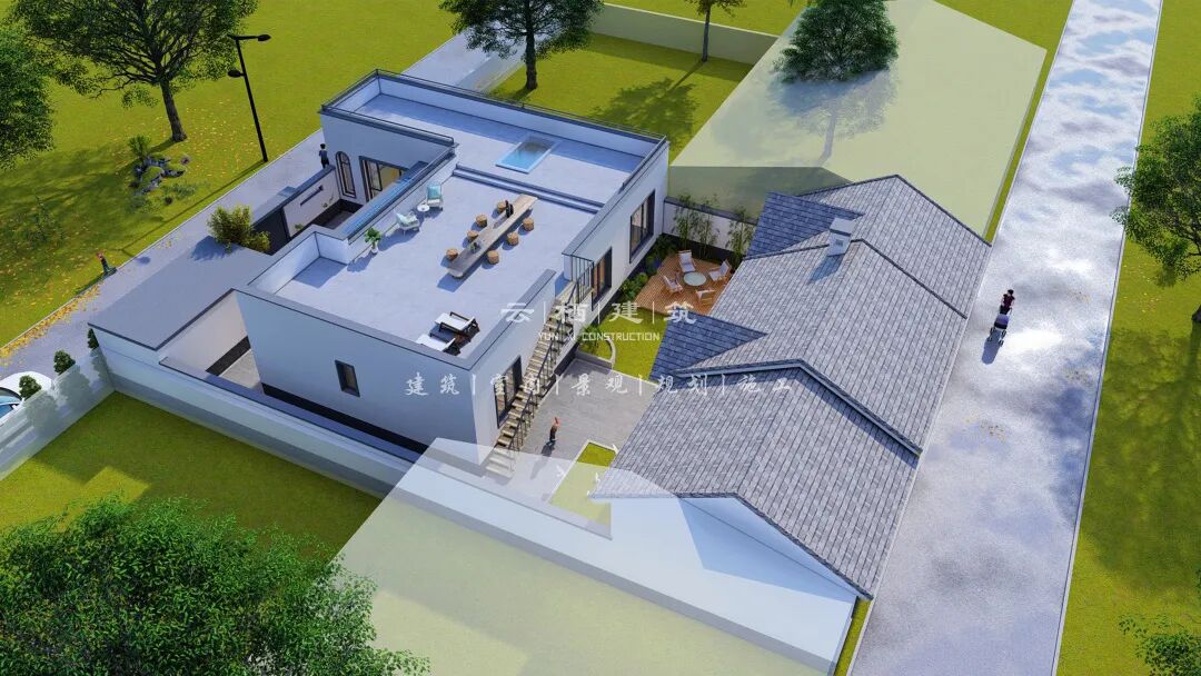 南房为现代风格,外立面材质选用白色真石漆和文化石搭配的方式,局部点缀的弧形体量活跃了整体建筑层次。北侧是老房原址翻盖,屋顶做不同高度的组合关系,形成阶梯状。