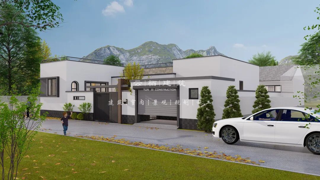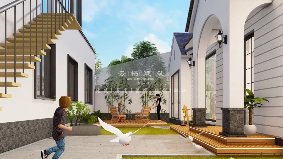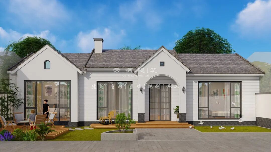北房为一层美式小别墅,简单而不失精致,结合门厅和外挑的室内阳台丰富建筑体量,形成错落有致的立面层次。庭院部分做了几处防腐木平台,用于休闲和交谈,提升空间使用率和趣味。