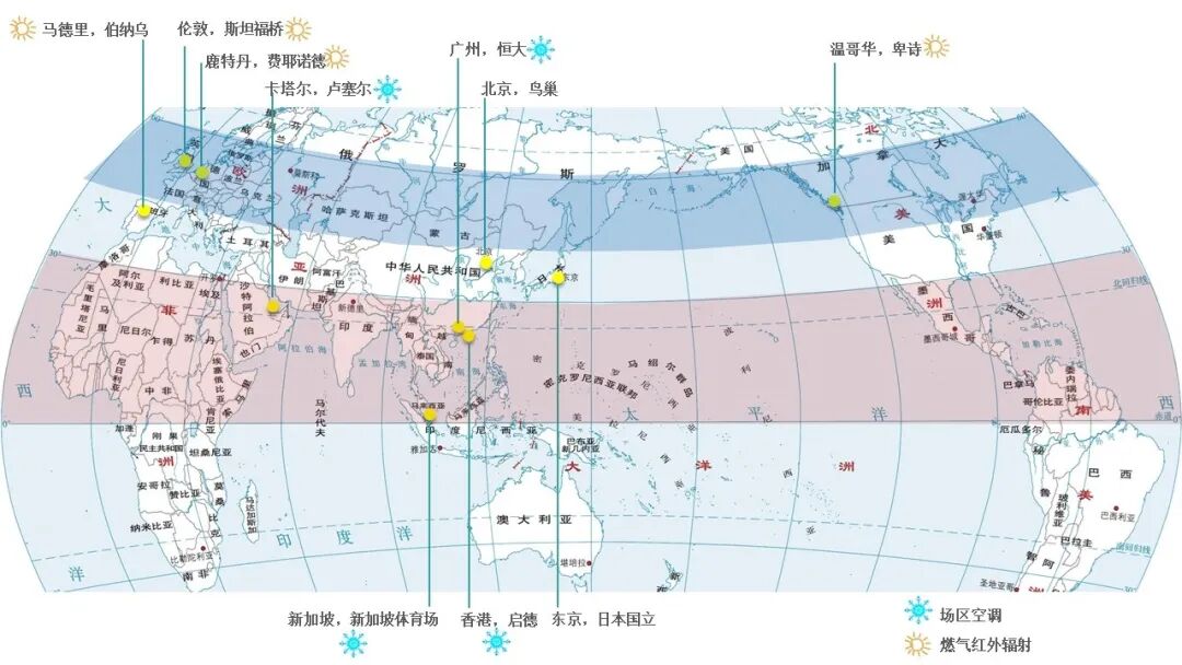 我们对比世界上一些主要体育场的舒适性设施设计,发现处于低纬度区域的体育场全年供冷时间较长,多采用场区空调系统;而处于高纬度寒冷区域的体育场则设置罩棚红外辐射系统的比率更高。