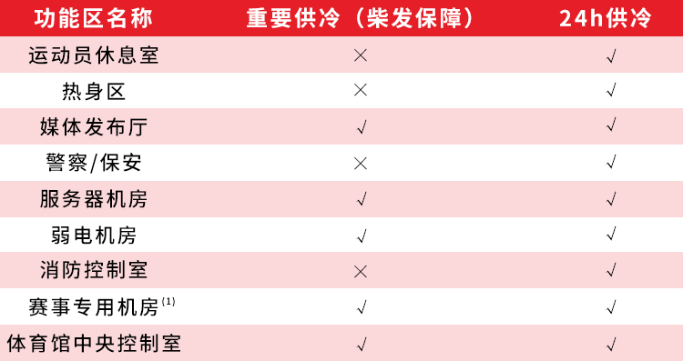 如承担赛事转播等重要用途的赛事专用机房,一旦冷源中断则影响颇大。在集中供冷出现故障的情况下,可切换至由柴油发电机提供供电保障的备用冷源,确保赛事转播不受影响。在赛事前后,运动员更衣室、热身区等空间通常有延时使用的需求,若集中空调系统未开启,则可使用备用冷源以确保区域功能。
