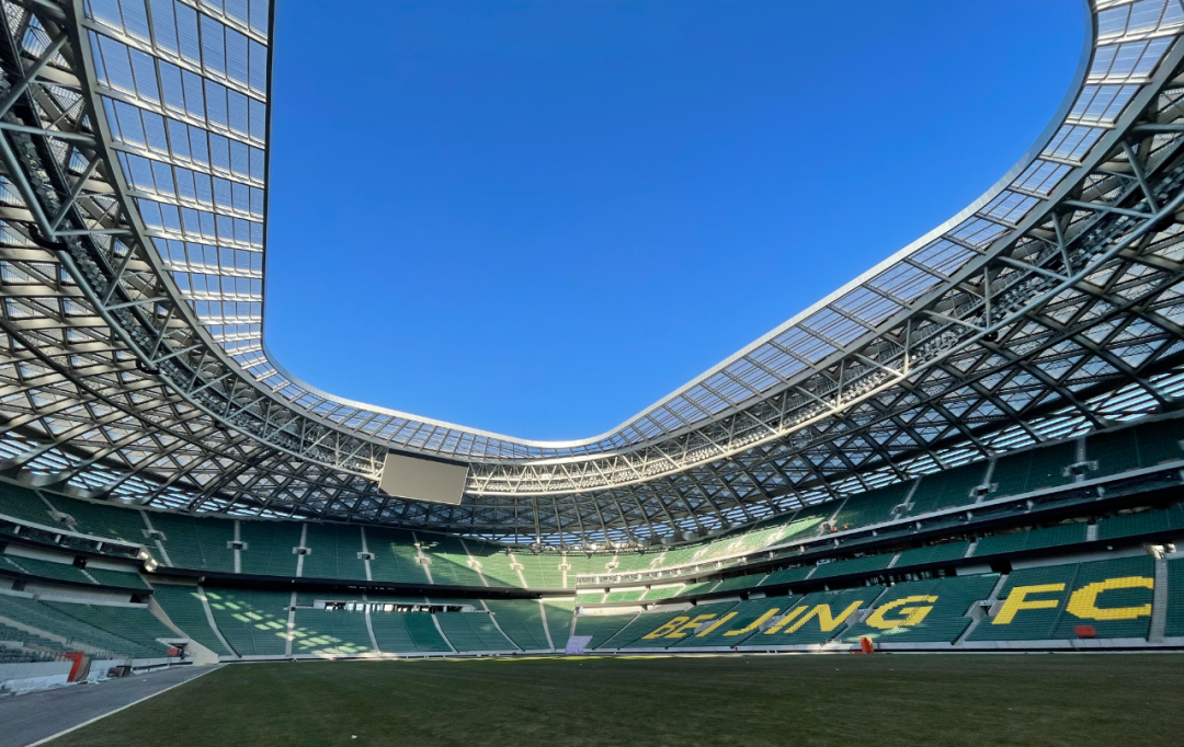 改造复建工程延续了工体庄重典雅的建筑风格,标志性清水混凝土外立面,传承首都朴素庄重的历史文化风貌。作为北京国安的永久主场,6.8万张“国槐绿”座椅填满看台。黄、绿两个主题色拼出“BEIJING FC”字样,呈现国安风采。