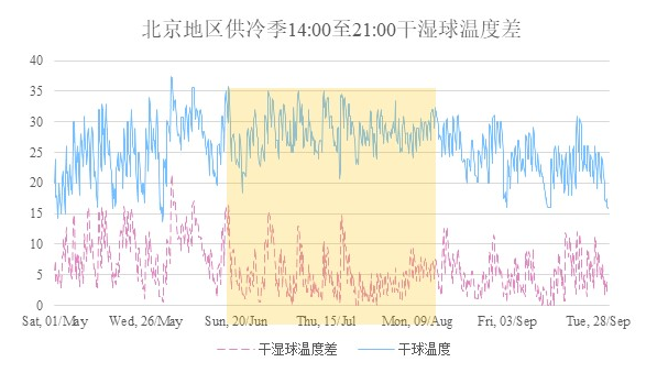 北京室外赛事运营的主要时段为下午两点至晚上九点。我们分析气象信息发现,在北京最炎热的7、8月份,该时段干、湿球温差亦有60%左右的时间大于4℃。为场区配备适宜的空气调节措施,对提升观赛舒适度至关重要。