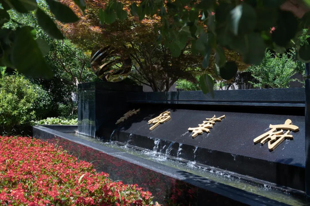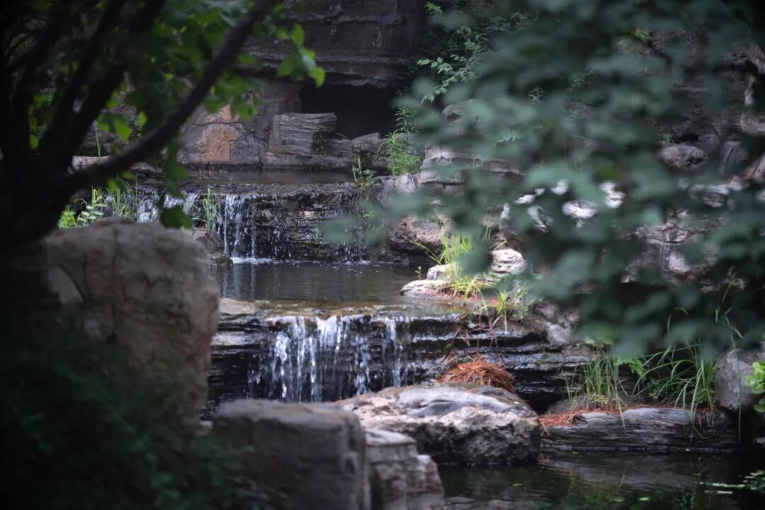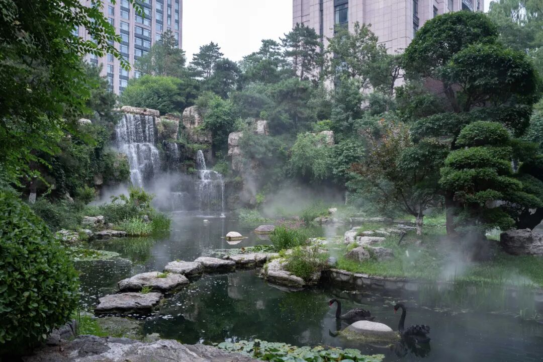 中心庭院“十米飞瀑”景观,用厚重的泰山石营造叠石效果