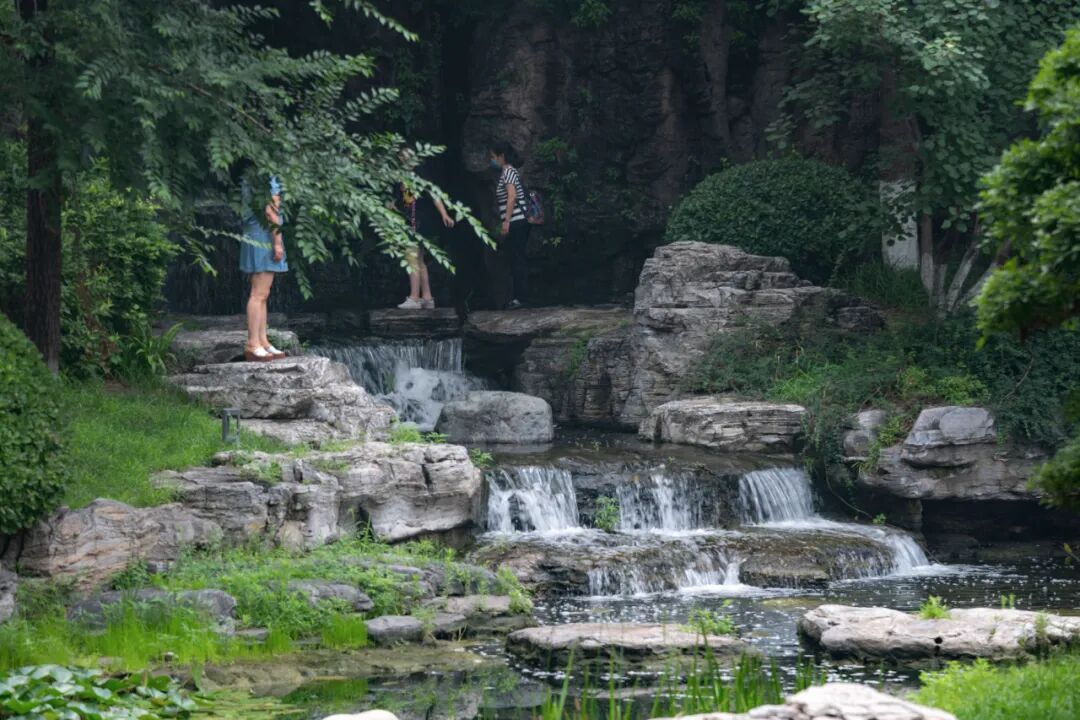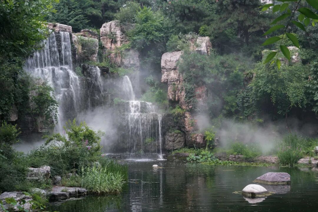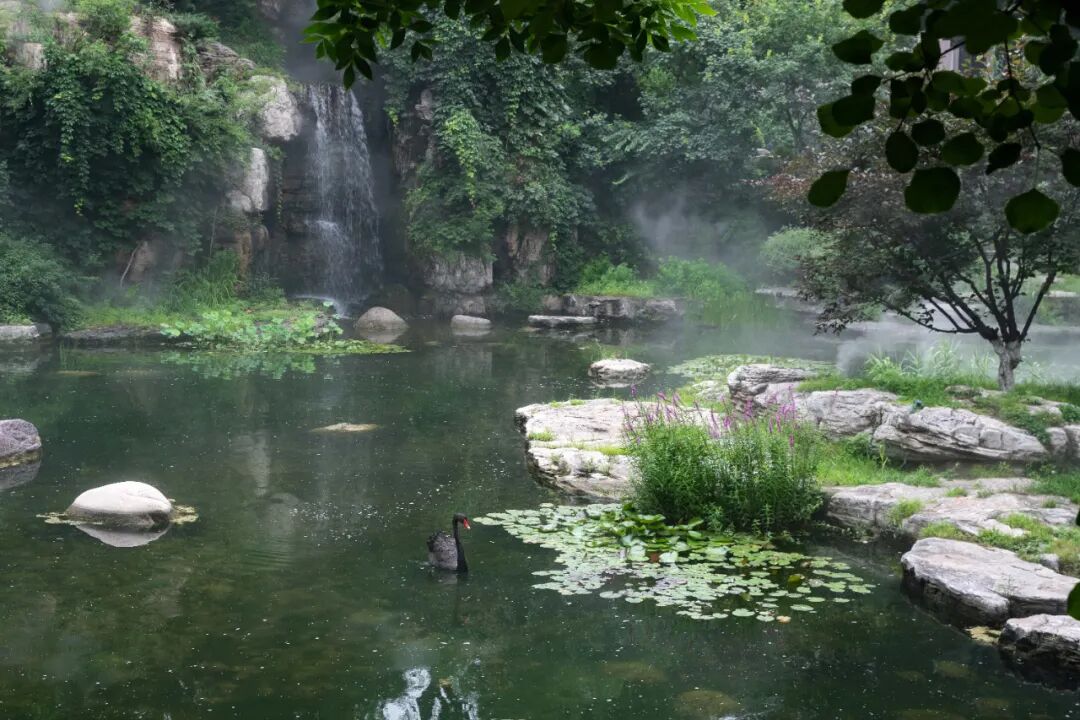 瀑布、水生植物、石头,宛如一幅浑然天成之景