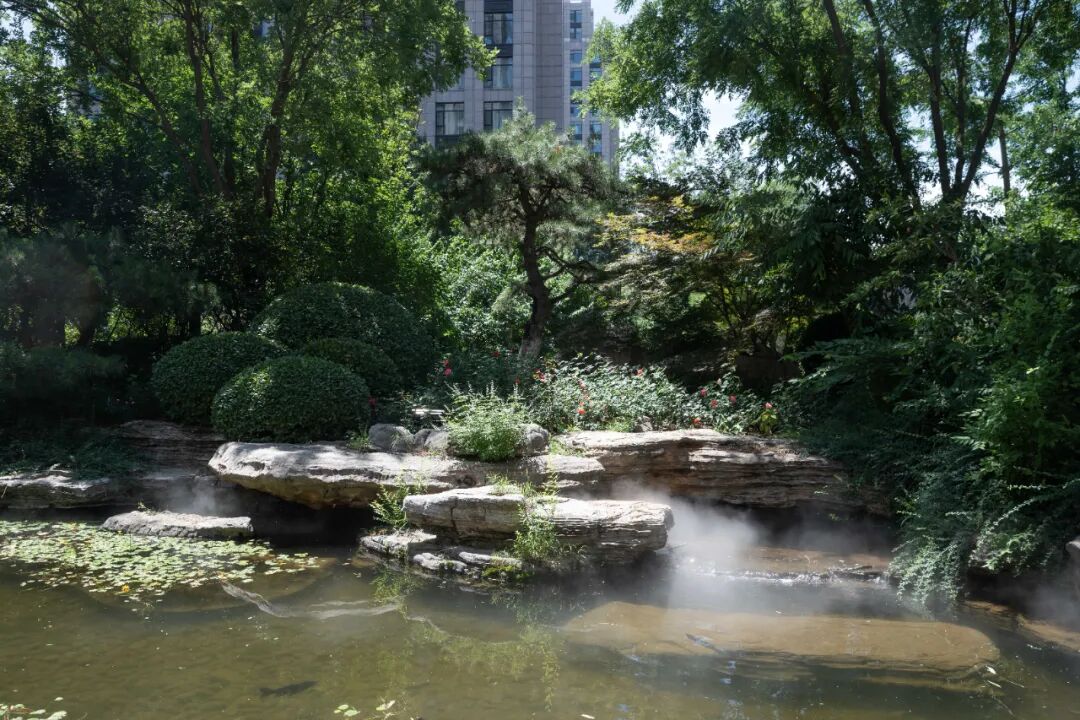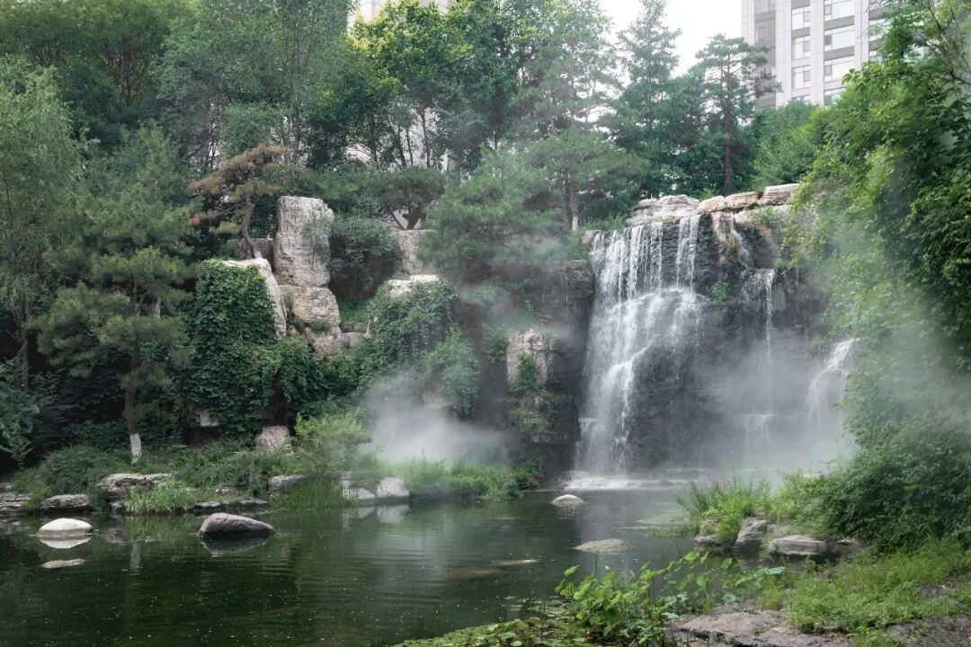 地形也赋予了“水”流动的生命力。水流从场地东北角开始引入一直流向北区的小湖景,并顺着地形流经瀑布。设计利用水的循环流动保持水的清洁,同时也能借助地形做功让水“活”起来,潺潺的水流营造出充满生机的氛围。炎炎夏日里,从瀑布跌落的流水可以为周边环境降温三至五度,为住宅区带来舒适宜人的空间,成为一处消夏避暑的圣地。水景底部设计了加温设备,可以使水在冬季依然保持潺潺流动,并能使水温恒定在5°左右,营造在寒冷的北方少见的冬季流水景观。