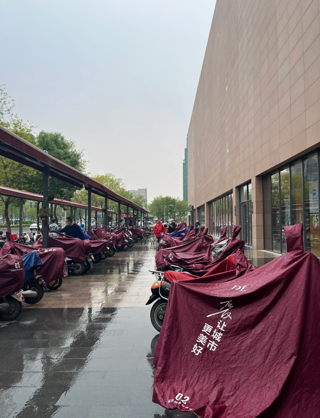 下雨天,胖东来的工作人员会贴心的给每一辆电动车盖上雨披;