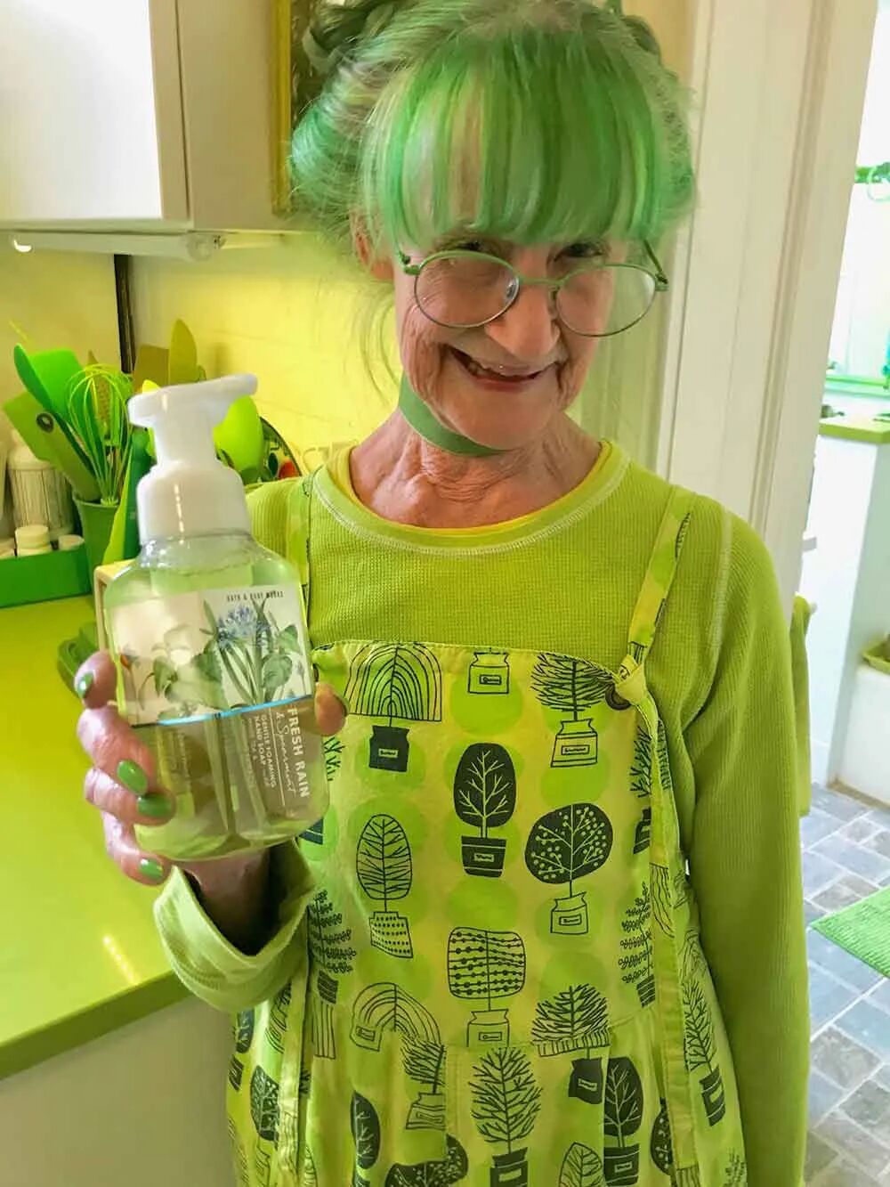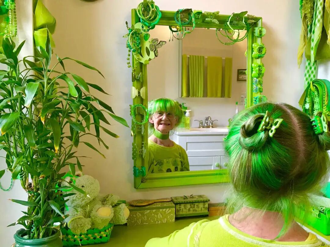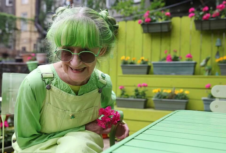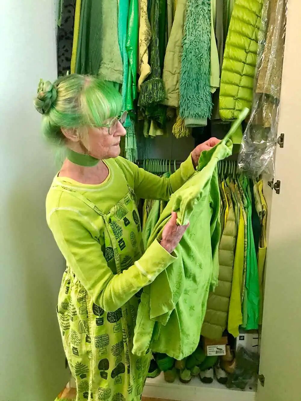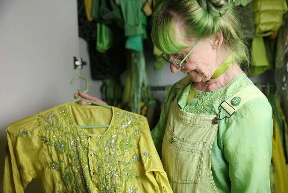 Elizabeth sweethear以艺术为生,绿色对她来说意味着一切。对她来说,最重要的绿色艺术品是她自己。如果东西对她来说不够绿,她会把它们涂上喜欢的绿色。所以她只穿绿色衣服,眼镜框、指甲、妆容甚至头发都是鲜绿色的。