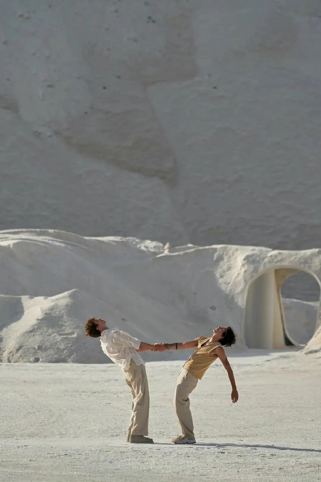 秀场选在南法普罗旺斯地区的阿尔勒盐山,素净开阔的视觉与整体色调平和的设计相得益彰。白色的盐山当好与白纸呼应,象征着一个巨大的背景板,山与天的边际清晰可见。
