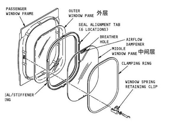 民航客机舷窗由三层窗户+通气孔组成,外层和中层都是密封严实的「结构窗户」,用来抵抗机舱内外压力差。