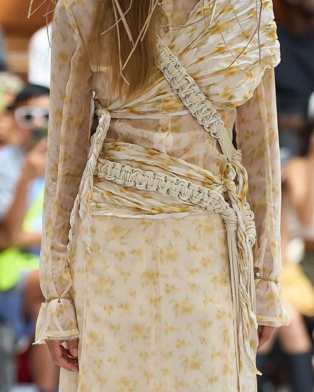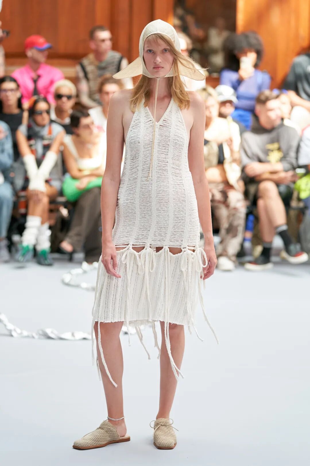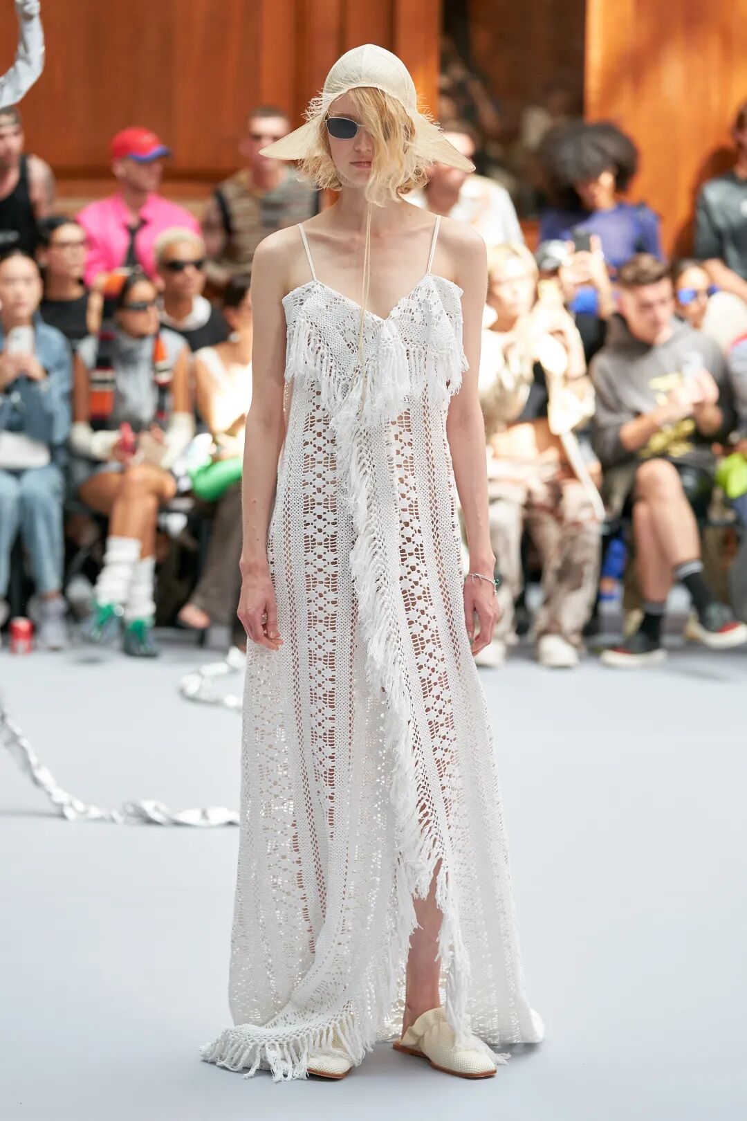 许多造型都是使用升级后的降落伞材料,这种材料以束带聚拢和流苏钩编吊带为设计灵感。绞花针织毛衣、镂空和网眼布和桌布制成的流苏镂空连衣裙让这个系列更加轻盈。