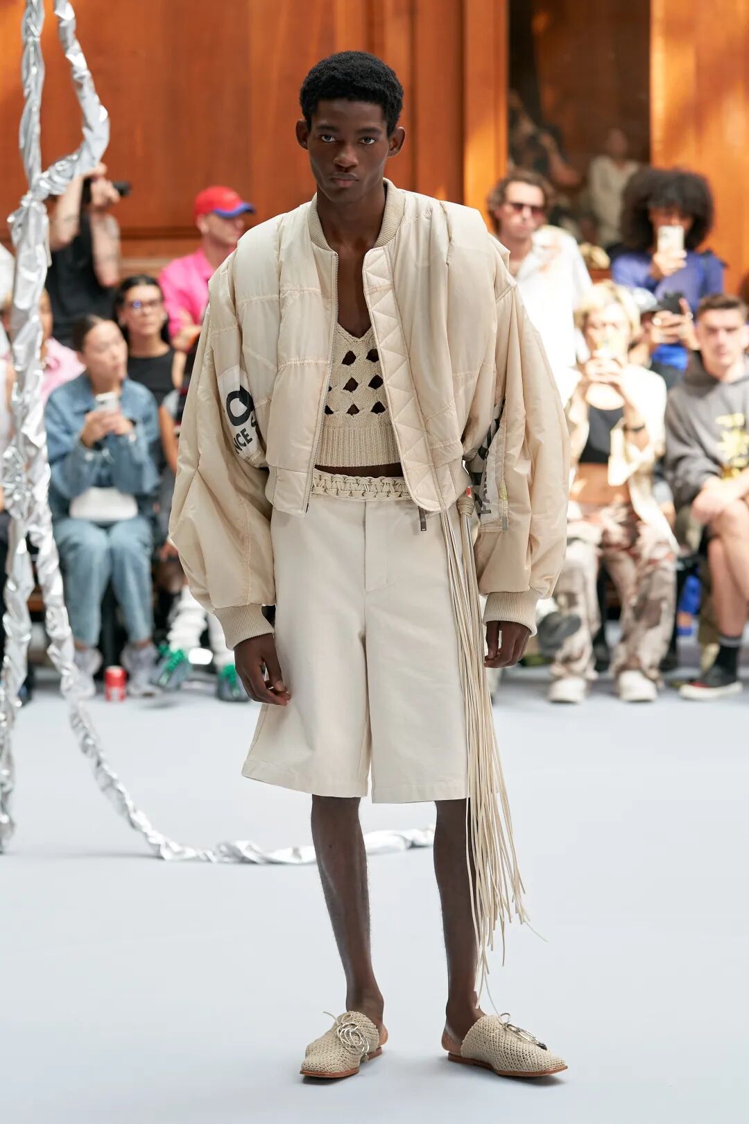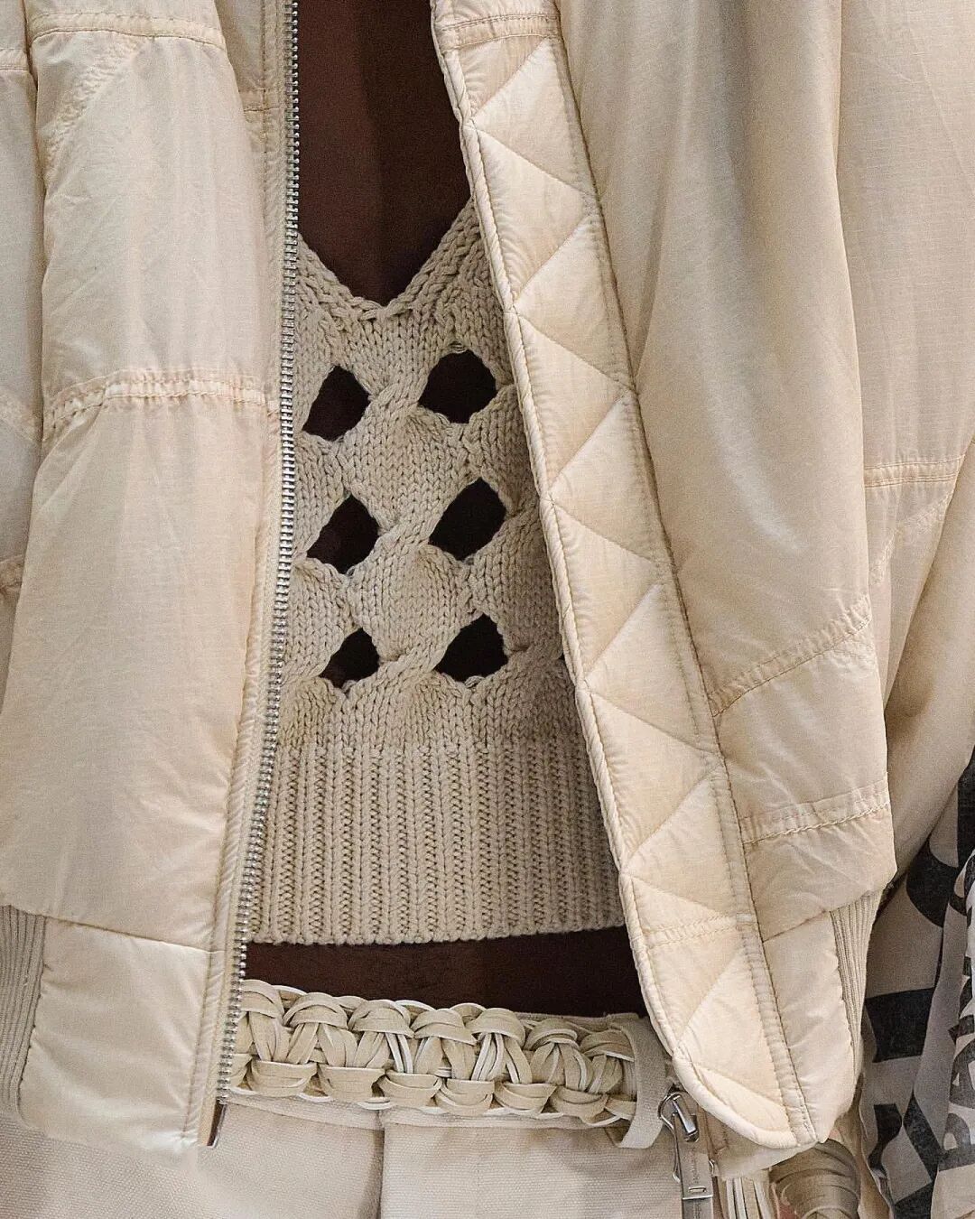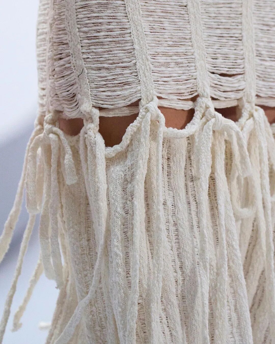 许多造型都是使用升级后的降落伞材料,这种材料以束带聚拢和流苏钩编吊带为设计灵感。绞花针织毛衣、镂空和网眼布和桌布制成的流苏镂空连衣裙让这个系列更加轻盈。