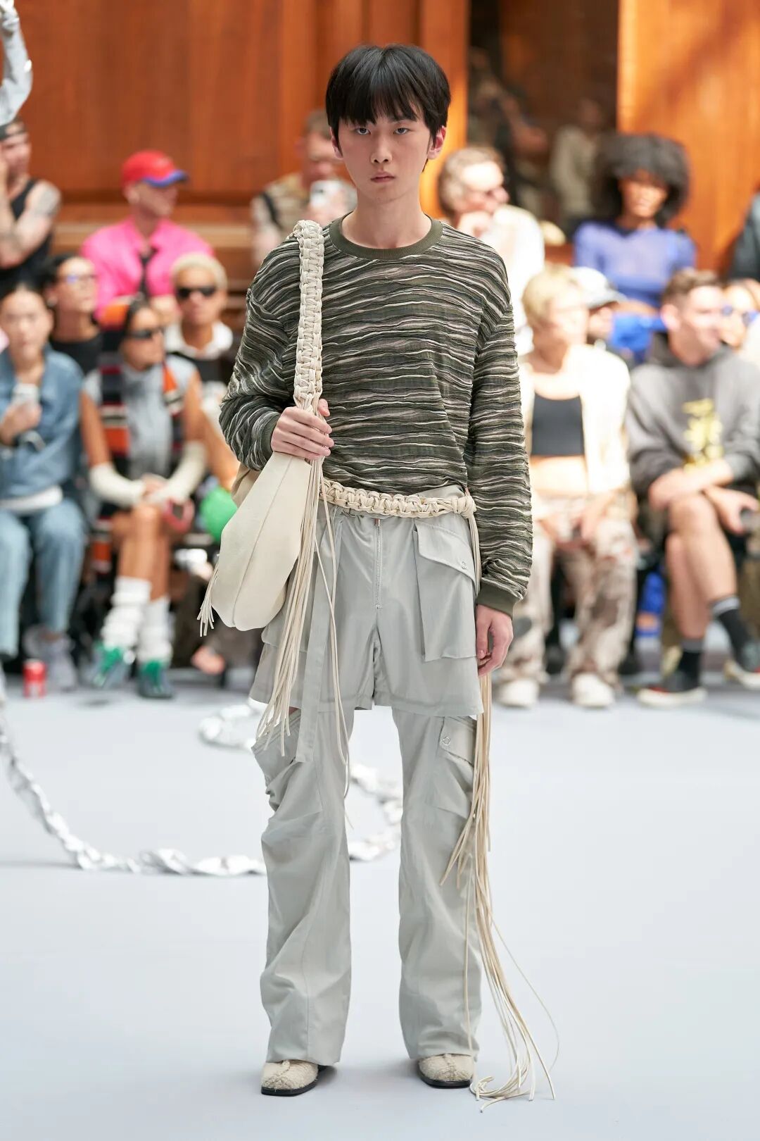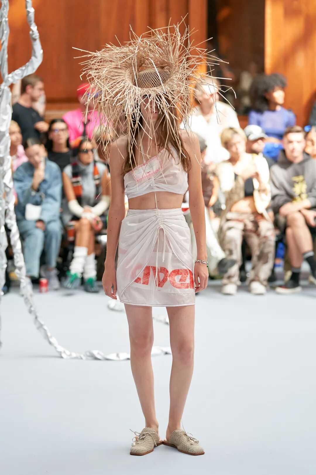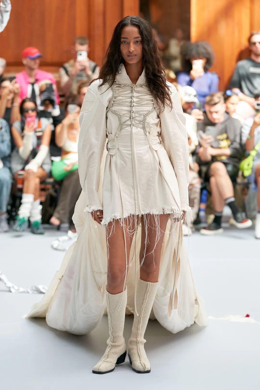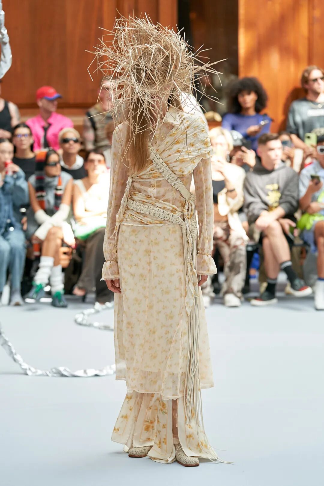 设计师将降落伞灵感元素融入服装和配饰中。用扣环做固定的连衣裙上出现自然的褶皱细节,而悬挂的编织绳则营造出流苏般的效果,并使用回收尼龙参与制作,坚持可持续时尚。