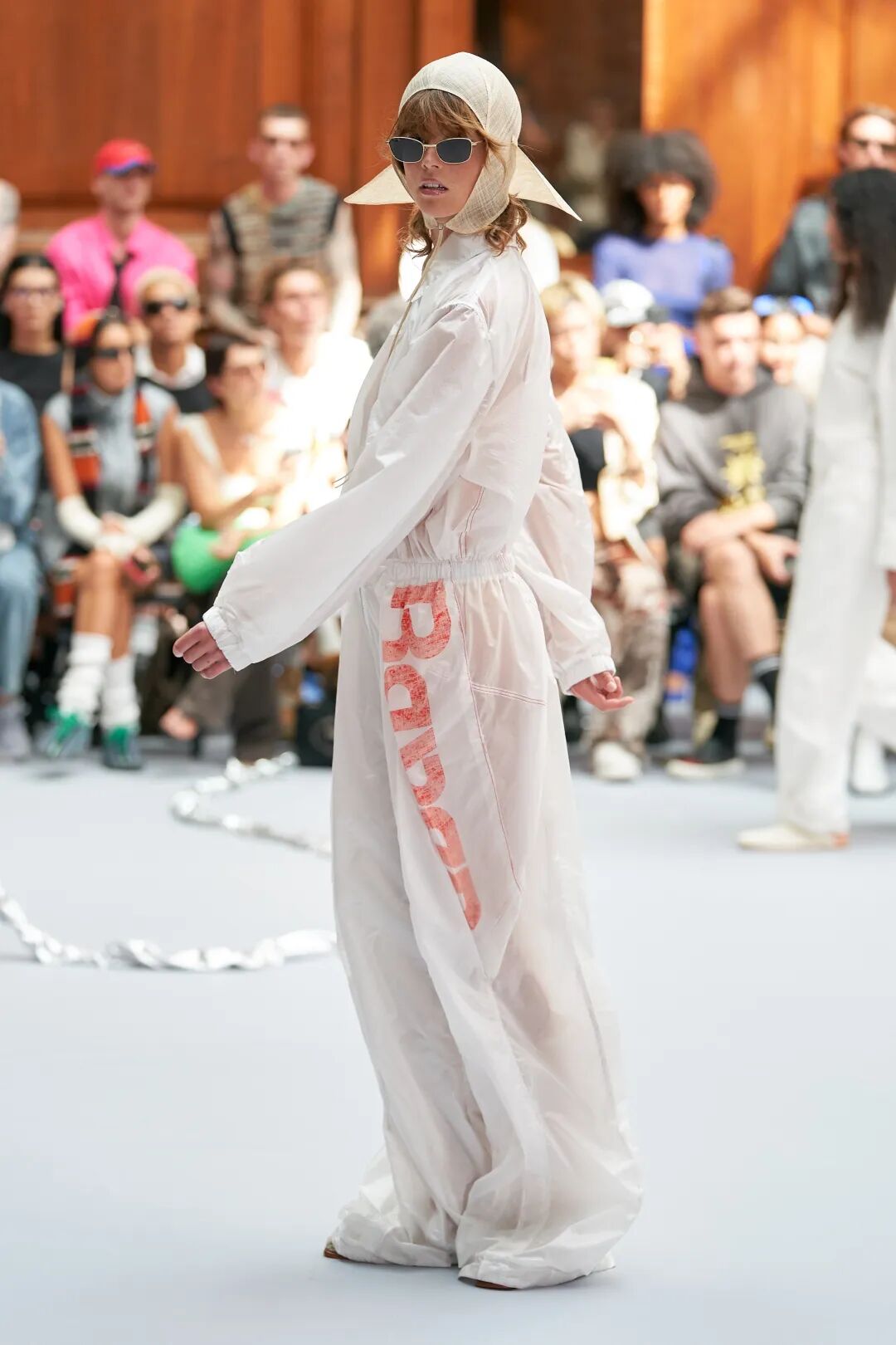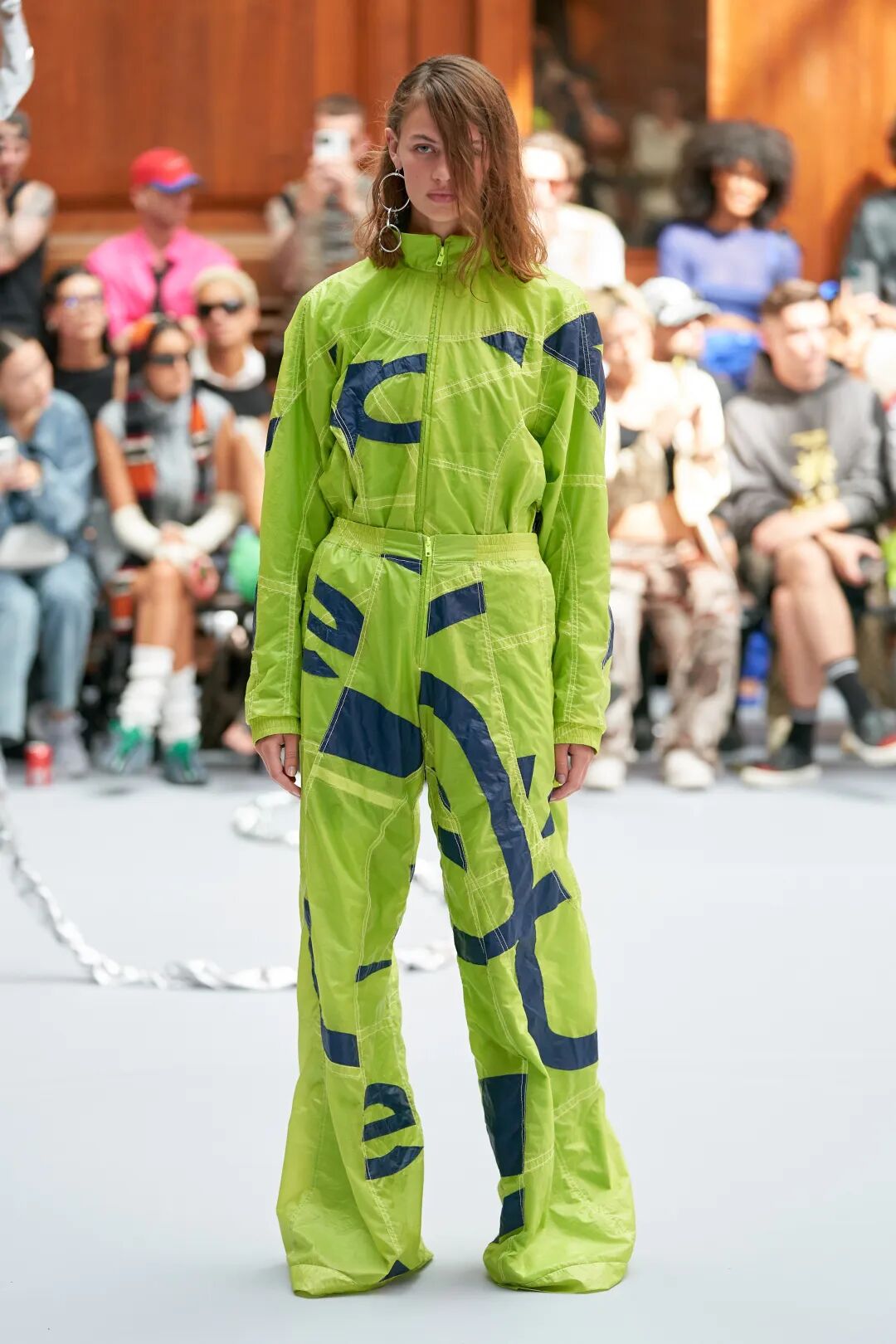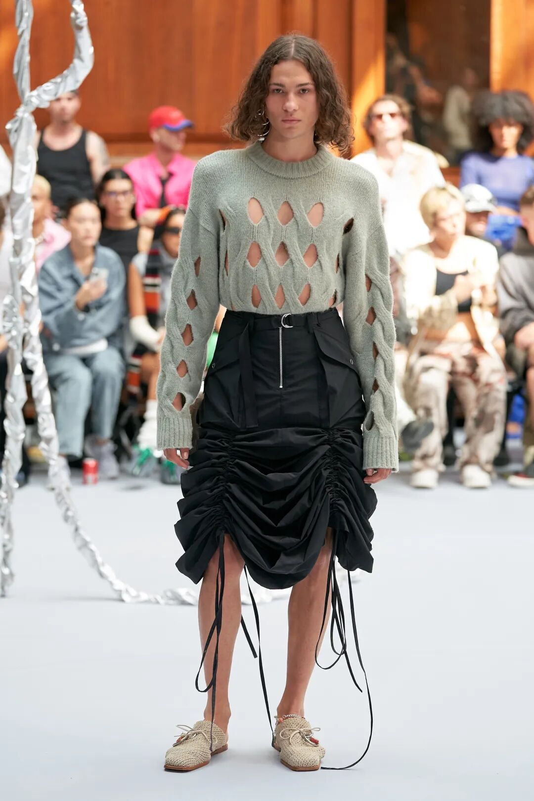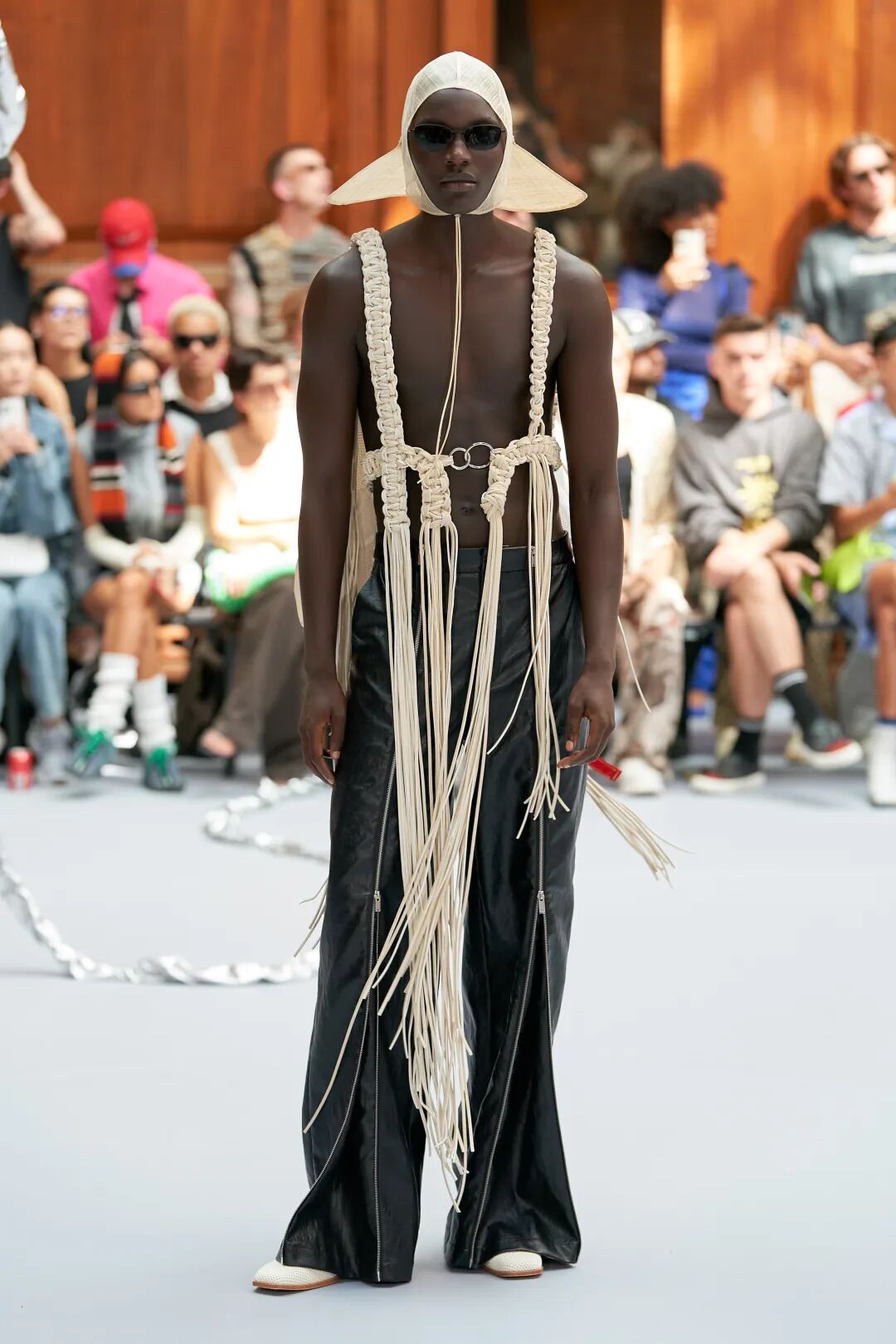 设计师将降落伞灵感元素融入服装和配饰中。用扣环做固定的连衣裙上出现自然的褶皱细节,而悬挂的编织绳则营造出流苏般的效果,并使用回收尼龙参与制作,坚持可持续时尚。