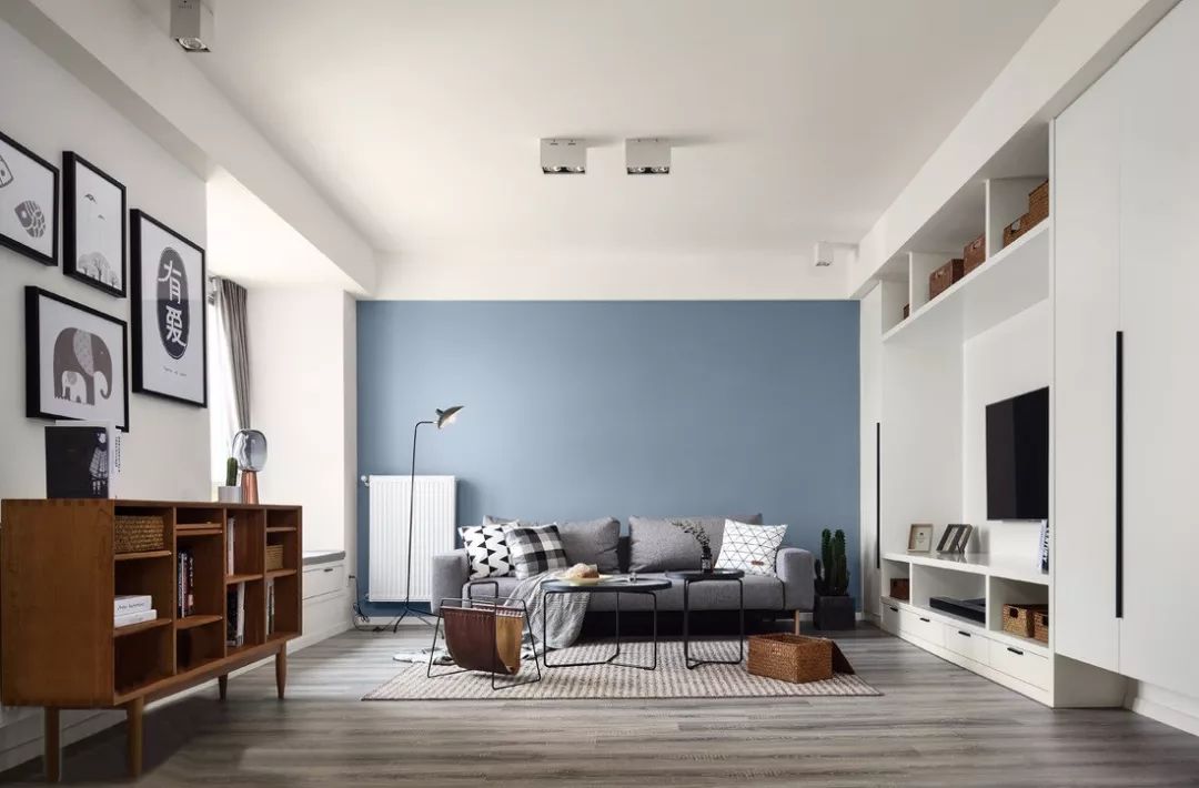 灰蓝色沙发墙把空间分割成三个立面,这三个立面的物件之间的联系被虚弱,这种安排就像我们把乱糟糟的抽屉里分出很多小格子,这样他们始终是整齐的。壁柜式的电视墙是不错的选择。