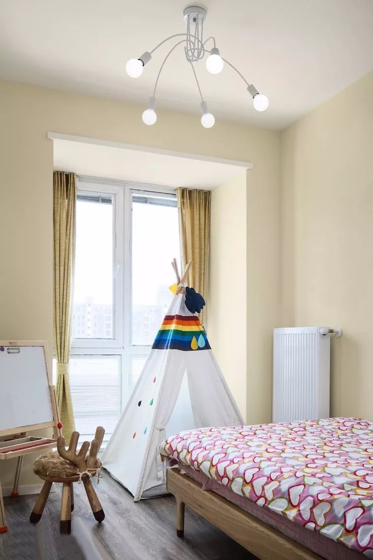 儿童房,用画板和小鹿凳子装点的,墙壁是奶黄色的,这种颜色让人心情愉快。一个四角帐篷 既可以方便孩子游戏,又增加了房间的丰富度。