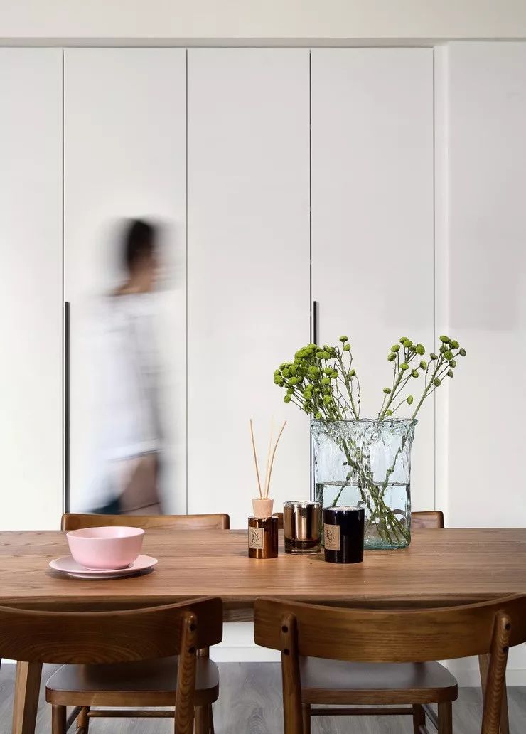 餐厅紧紧挨着客厅,花纹块毯形成了客厅的潜意识边界线,餐厅区把实木的色彩作为主要色彩,几乎没有去想办法丰富,一个数插画,一个粉色的碗碟。
