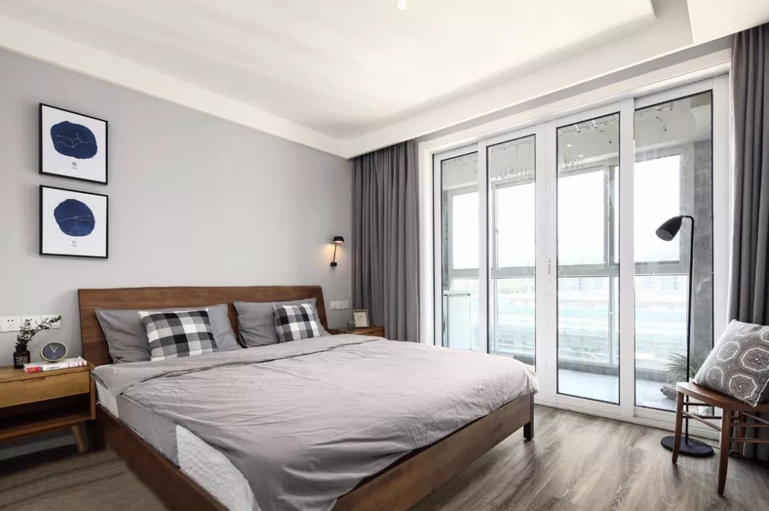 这里配色问题没有,本色家具,配合黑白灰的床品,墙壁上的装饰画都是黑色的。