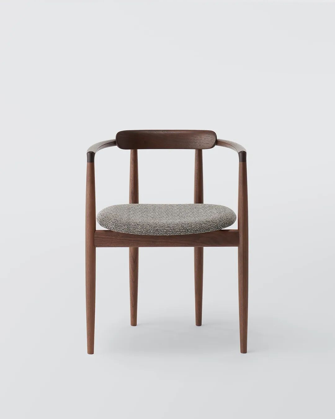 Miau 扶手椅是一把实木椅子,有四个锥形腿、一个弯曲的扶手和一个靠背。