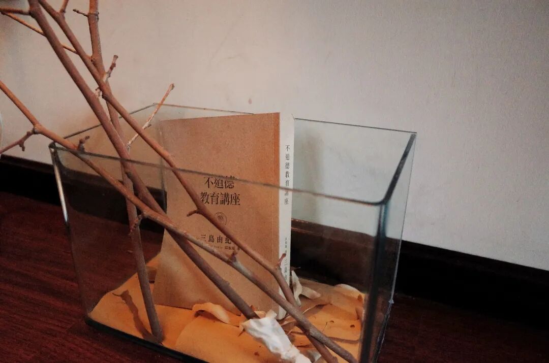 铁雄家的一角:枯木和一本三岛由纪夫的《不道德教育讲座》。