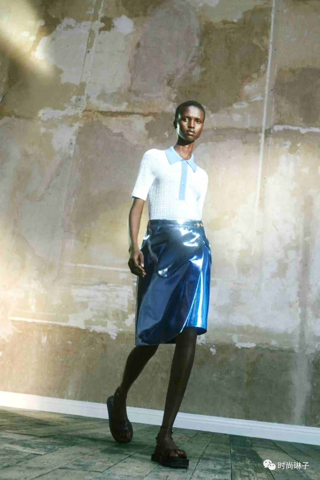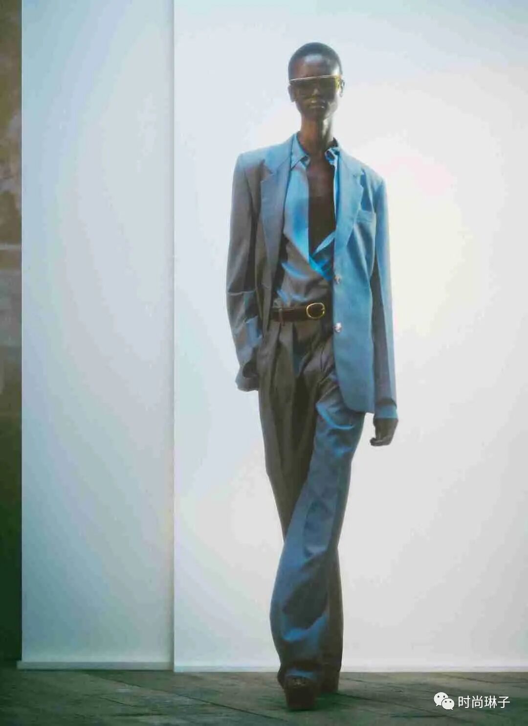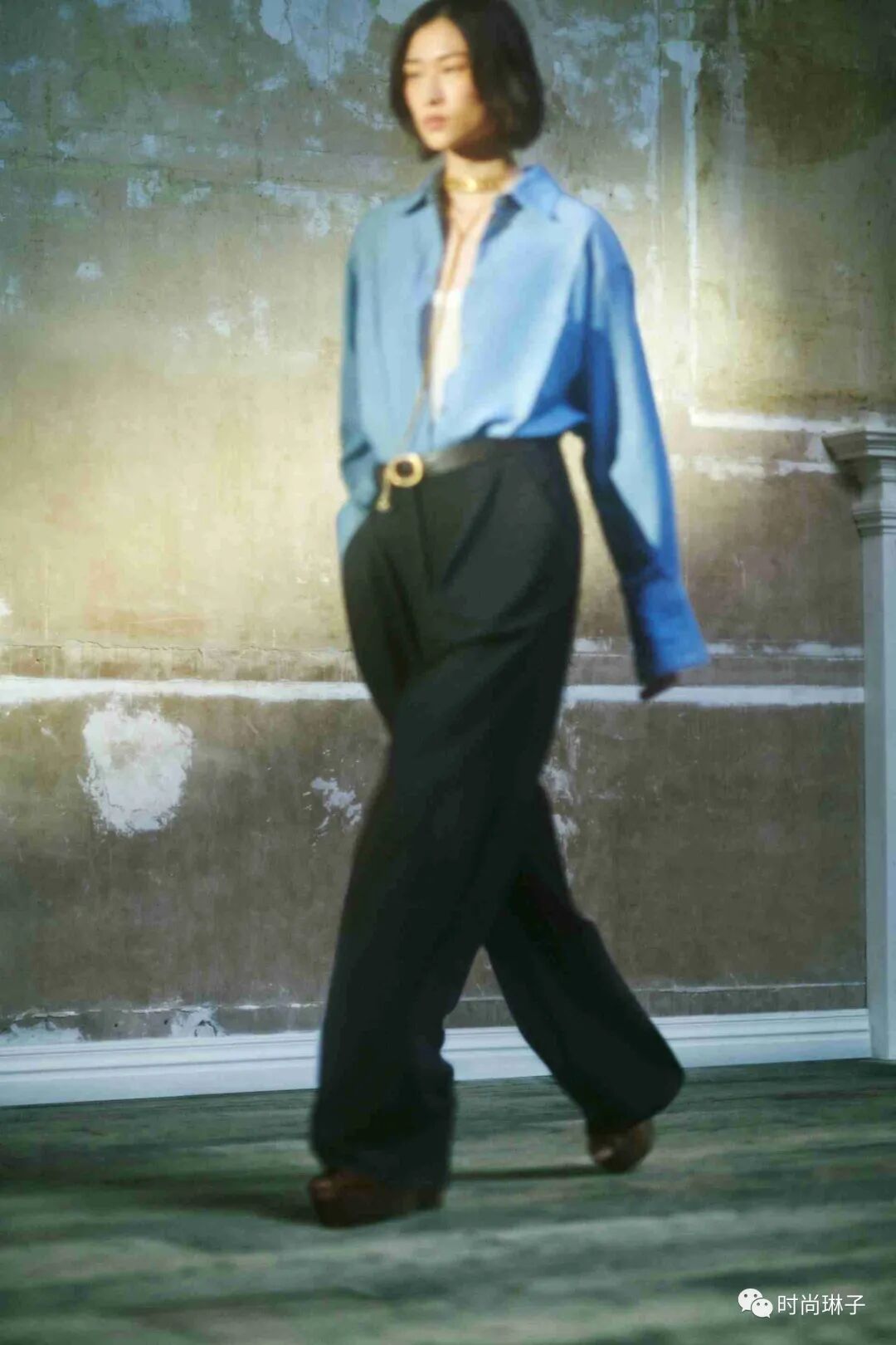 Victoria Beckham 2022春夏系列的线条干净利落。贝克汉姆的蓝色衬衫被重新设计,穿着宽松的男神衬衫,休闲且舒适。