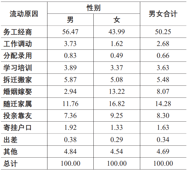 较大的区别显示在流动原因上。从整体来看,务工经商、随迁家属与婚姻嫁娶都能构成男女人口流动的主要因素。但其中,男性流动人口主要表现为经济型流动,务工经商者的比重接近60%,婚姻嫁娶的比重则仅仅只有不到3%。