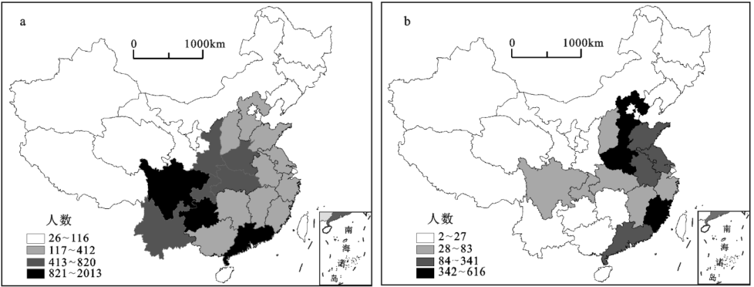 ▲ 1980~2015年儿童拐出总图(左)和拐入总图(右)来源:李钢等