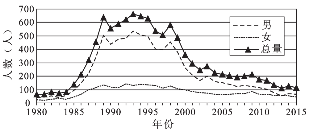 ▲ 1980~2015年拐卖儿童犯罪量统计 来源:李钢等