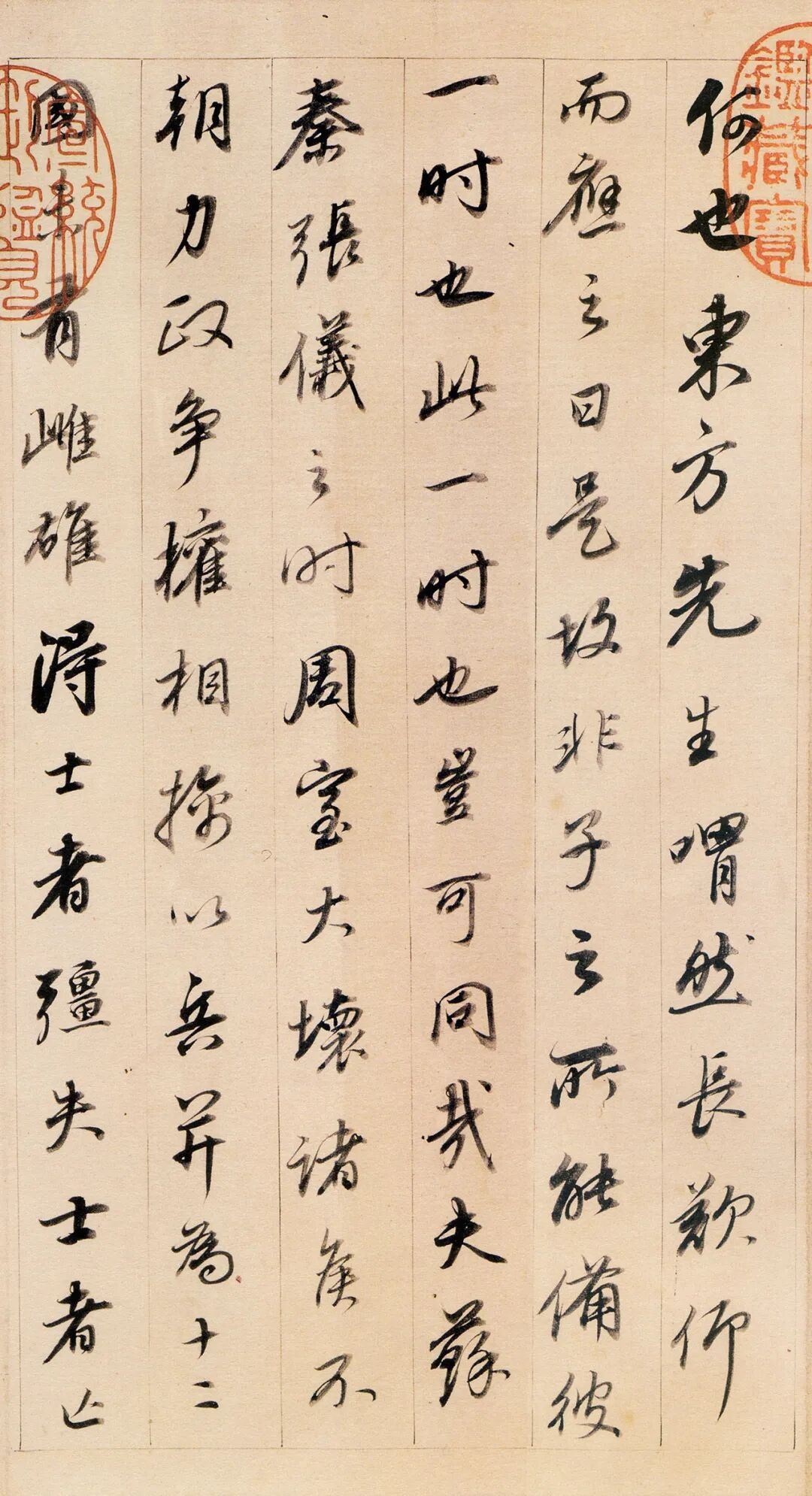 【3】何也?”东方先生喟然长息,仰而应之,曰:“是故非子之所能备。彼一时也,此一时也,岂可同哉!夫苏秦张仪之时,周室大坏,诸侯不朝,力政争权,相擒以兵,并为十二国,未有雌雄。得士者强,失士者亡,