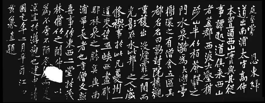 公元1100年(元符三年)黄庭坚复官。1101年东归途经万州,应故友南浦太守高仲本之邀游西山(又名太白岩),并作《西山题记》。《西山题记》是万州高笋塘流杯亭內,摩崖石刻。镌刻在天然石上,原本不应称“碑”,因当地人习惯,故称之《西山碑》。此碑高1米,宽2.6米,共21行,173字。《寰宇访碑录》有著录,曾国藩赞誉此碑为“海内存世黄书第一”。此篇为《西山记》题刻(清拓本)。