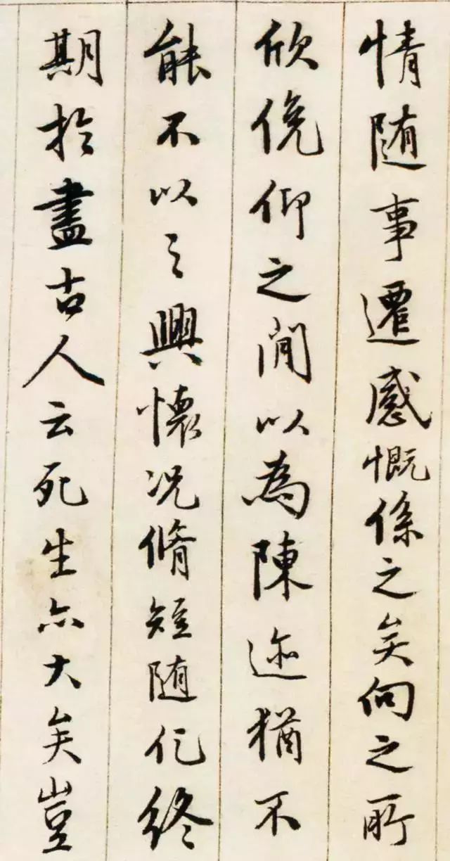 【5】情随事迁,感慨系之矣。向之所欣,俯仰之间,已为陈迹,犹不能不以之兴怀。况修短随化,终期于尽。古人云:“死生亦大矣。”岂