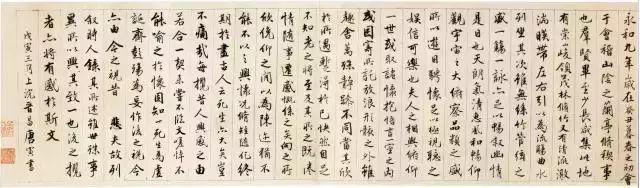 唐伯虎的书法曾泛学赵孟頫、李邕、颜真卿、米芾各家。其书法风格丰润灵活,俊逸挺秀,妩媚多姿,行笔圆熟而洒脱。在诗文上,与祝允明、文徵明、徐祯卿并称“吴中四才子”。在绘画上,与沈周、文徵明、仇英并称“吴门四家”,又称为“明四家”。世人皆谓唐伯虎的字,风流。从唐伯虎临王羲之《兰亭序》书法看,其书放浪形骸,更显风流。
