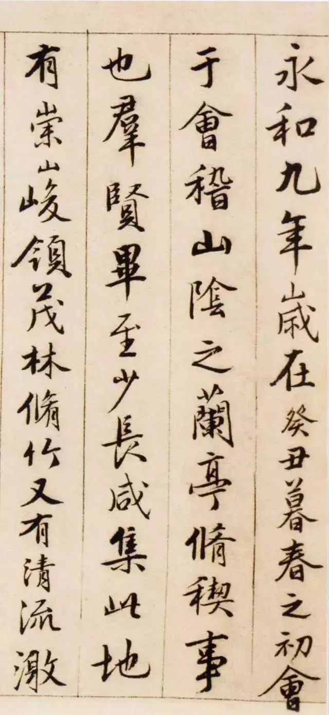 【1】永和九年,岁在癸丑,暮春之初,会于会稽山阴之兰亭,修禊事也。群贤毕至,少长咸集。此地有崇山峻岭,茂林修竹;又有清流激