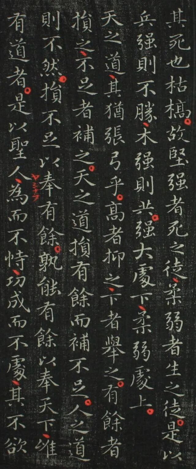 【51】其死也枯槁。故曰坚强者死之徒,柔弱者生之徒。是以兵强则灭,木强则折。强大处下,柔弱处上。天之道,其犹张弓欤?高者抑之,下者举之;有余者损之,不足者补之。天之道,损有余而补不足。人之道则不然,损不足以奉有余。孰能有余以奉天下,唯有道者。是以圣人为而不恃,功成而不处,其不欲