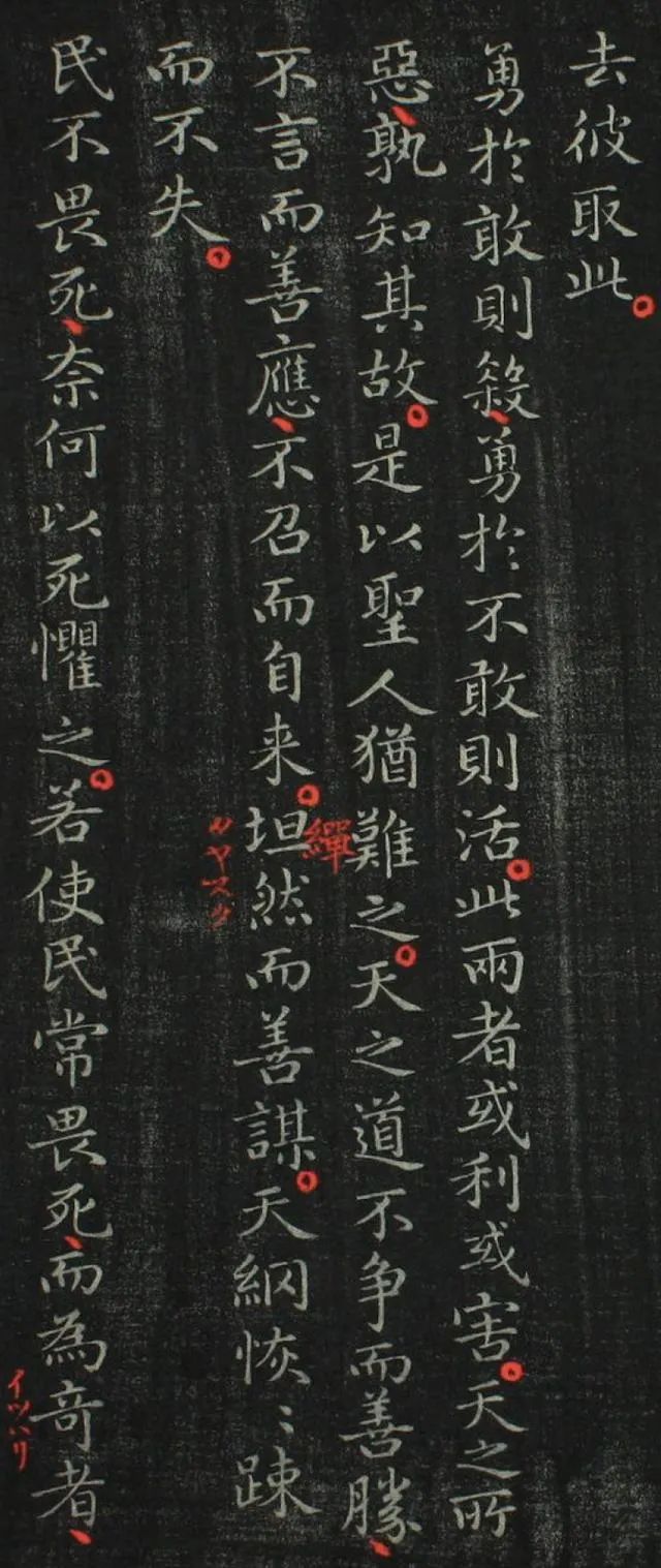 【49】去彼取此。勇于敢者则杀,勇于不敢者则活。此两者,或利或害。天之所恶,孰知其故?天之道,不争而善胜,不言而善应,不召而自来,坦然而善谋。天网恢恢,疏而不失。若民恒且不畏死,奈何以杀惧之也?若民恒且畏死,则为奇者,