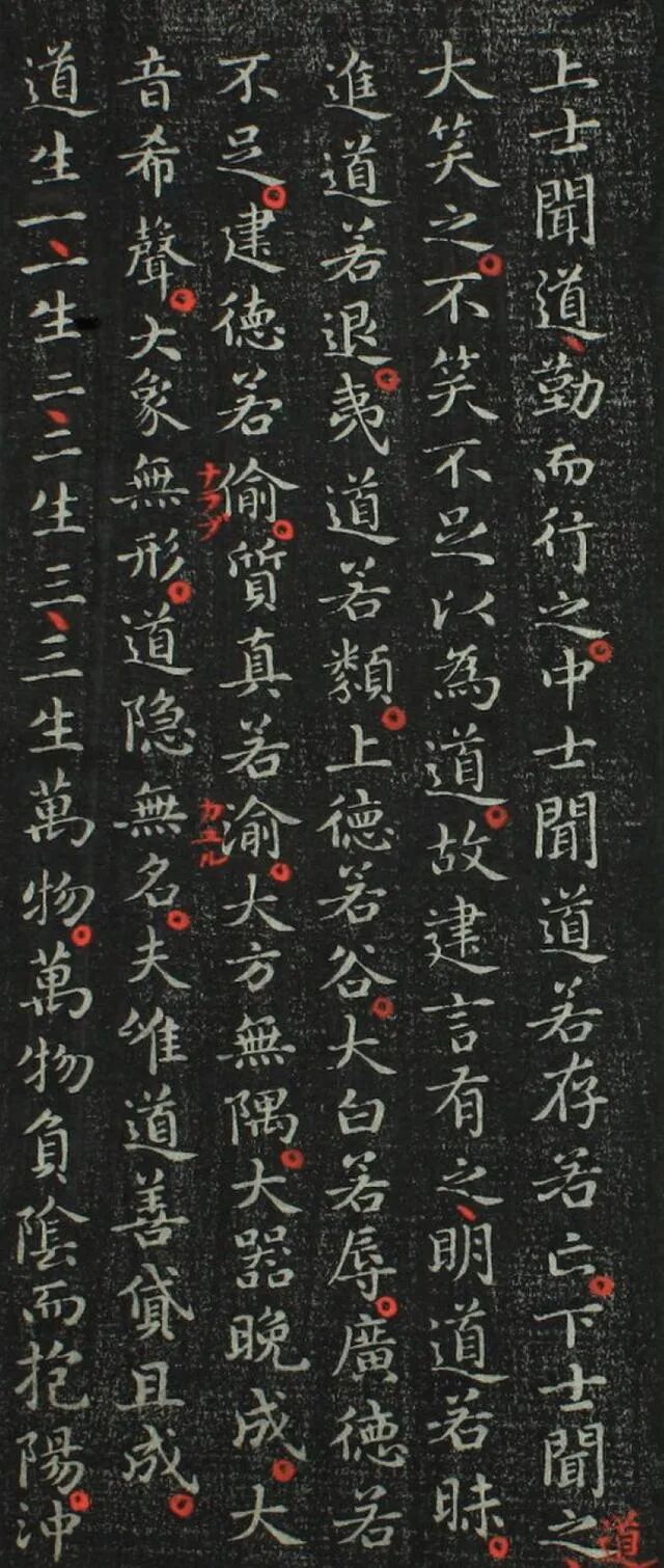 【29】上士闻道,勤而行之;中士闻道,若存若亡;下士闻道,大笑之。不笑不足以为道。故建言有之:明道若昧;进道若退;夷道若颣;上德若谷,大白若辱,广德若不足,建德若偷,质真若渝;大方无隅;大器晚成;大音希声;大象无形。道隐无名。夫唯道,善始且善成。道生一,一生二,二生三,三生万物。万物负阴而抱阳,冲