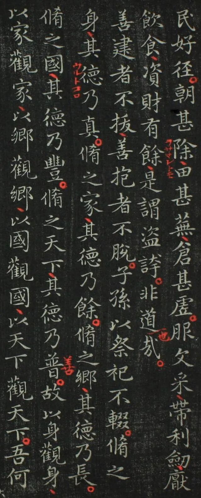 【36】好径。朝甚除,田甚芜,仓甚虚;服文采,带利剑,厌饮食,财货有余;是谓盗夸。非道也哉!善建者不拔,善抱者不脱,子孙以祭祀不辍。修之身,其德乃真;修之家,其德乃余;修之乡,其德乃长;修之邦,其德乃丰;修之天下,其德乃普。故以身观身,以家观家,以乡观乡,以邦观邦,以天下观天下。吾何