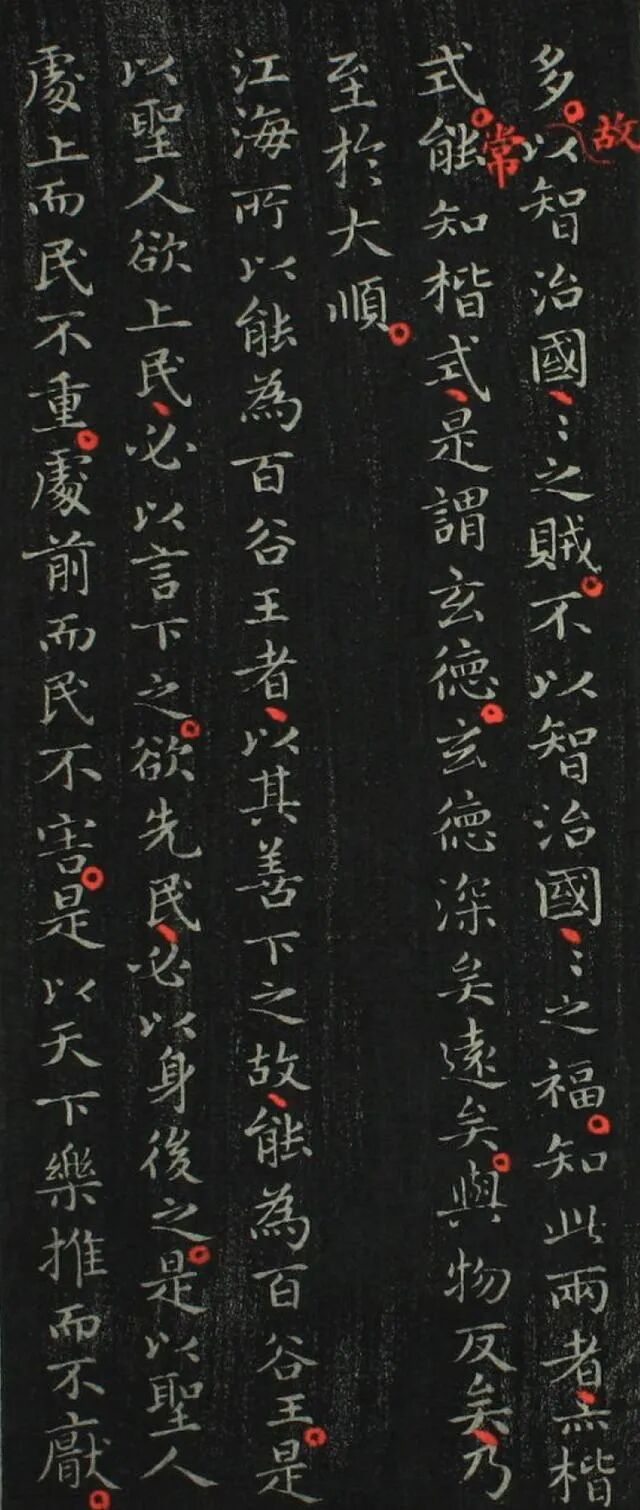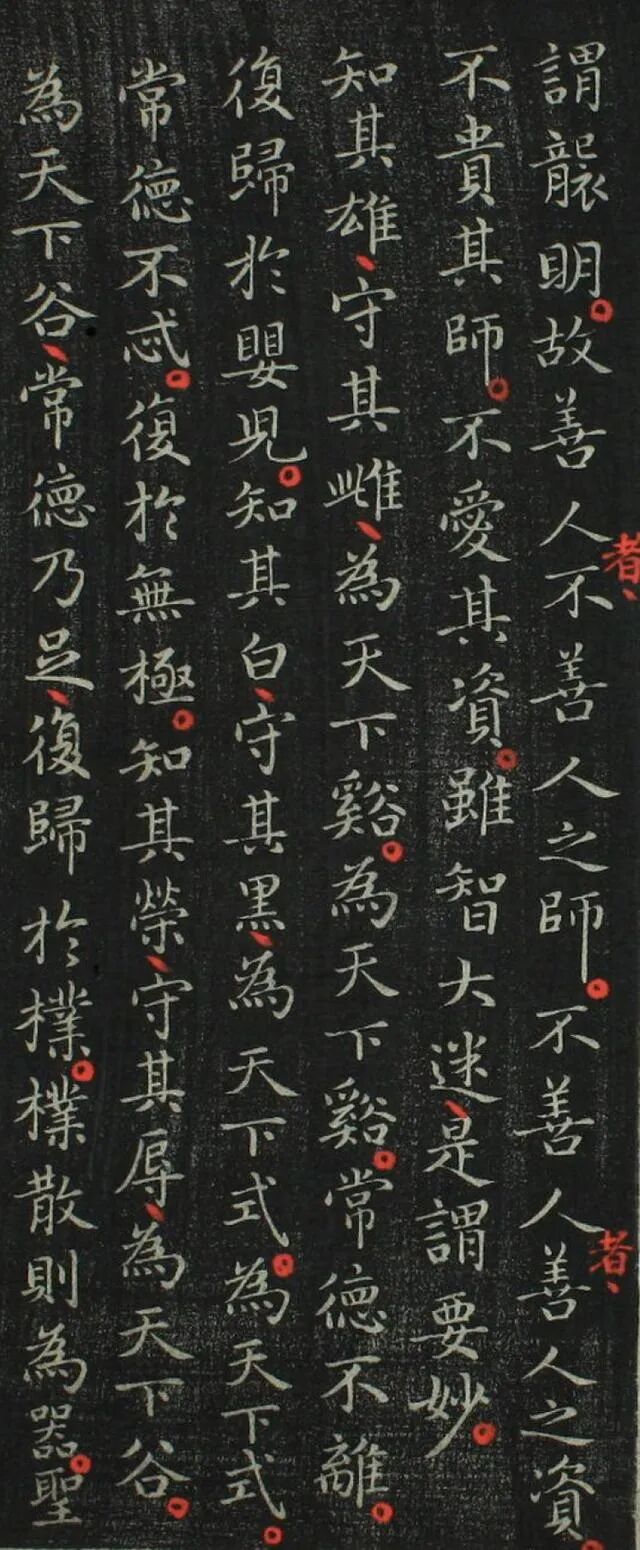 【19】谓袭明。故善人者,不善人之师;不善人者,善人之资。不贵其师,不爱其资,虽智大迷。是谓要妙。知其雄,守其雌,为天下谿。为天下谿,常德不离,复归于婴儿。知其白,守其黑,为天下式。为天下式,常德不忒,复归于无极。知其荣,守其辱,为天下谷。为天下谷,常德乃足,复归于朴。朴散则为器,圣