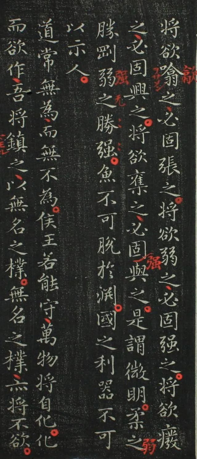 【25】将欲歙之,必固张之;将欲弱之,必固强之;将欲废之,必固举之;将欲取之,必固予之。是谓微明。柔弱胜刚强。鱼不可脱于渊,国之利器不可以示人。道常无为,而无不为。侯王若能守之,万物将自化。化而欲作,吾将镇之以无名之朴。无名之朴,夫亦将不欲。