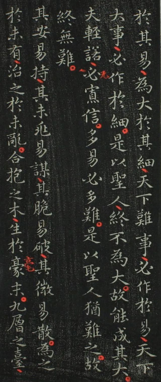 【43】于其易,为大于其细。天下难事,必作于易;天下大事,必作于细。是以圣人终不为大,故能成其大。夫轻诺必寡信,多易必多难。是以圣人犹难之,故终无难矣。其安易持,其未兆易谋。其脆易泮,其微易散。为之于未有,治之于未乱。合抱之木,生于毫末;九层之台,