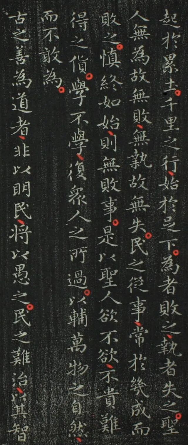 【44】起于累土;千里之行,始于足下。为者败之,执者失之。是以圣人无为故无败,无执故无失。民之从事,常于几成而败之。不慎终也。慎终如始,则无败事。是以圣人欲不欲,不贵难得之货;学不学,复众人之所过。以辅万物之自然而不敢为。古之为道者,非以明民,将以愚之。民之难治,以其智